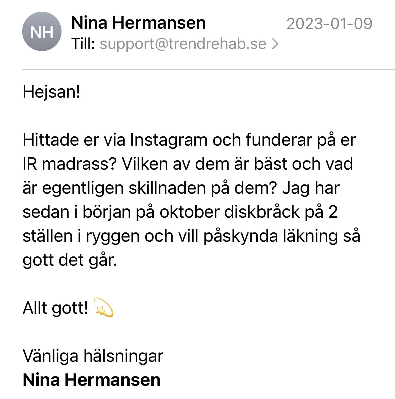 Jag googlade och kontaktade då Trend Rehab och ställde lite frågor. Fick ett otroligt proffsigt svar tillbaka, en utförlig förklaring på skillnaderna mellan de olika madrasserna och vad de kan göra för kroppen. Jag blev eld och lågor och beställde en direkt. Vi mejlade vidare också efter att jag fått den och kom överens om att jag nu får ge er en rabattkod också. Ninah ger dig hela 25% rabatt t.o.m. 2/7.