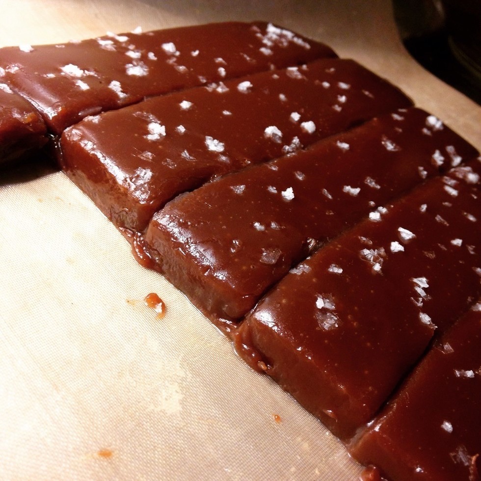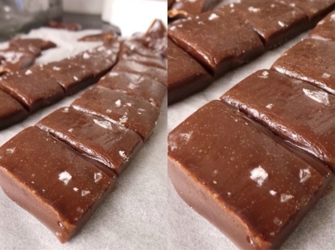 3) Tillsätt vaniljsockret mot slutet. Häll i smeten i en form med bakplåtspapper. Strö över flingsalt. Låt stelna. Skär upp i bitar och slå gärna in i bakplåtspapper.