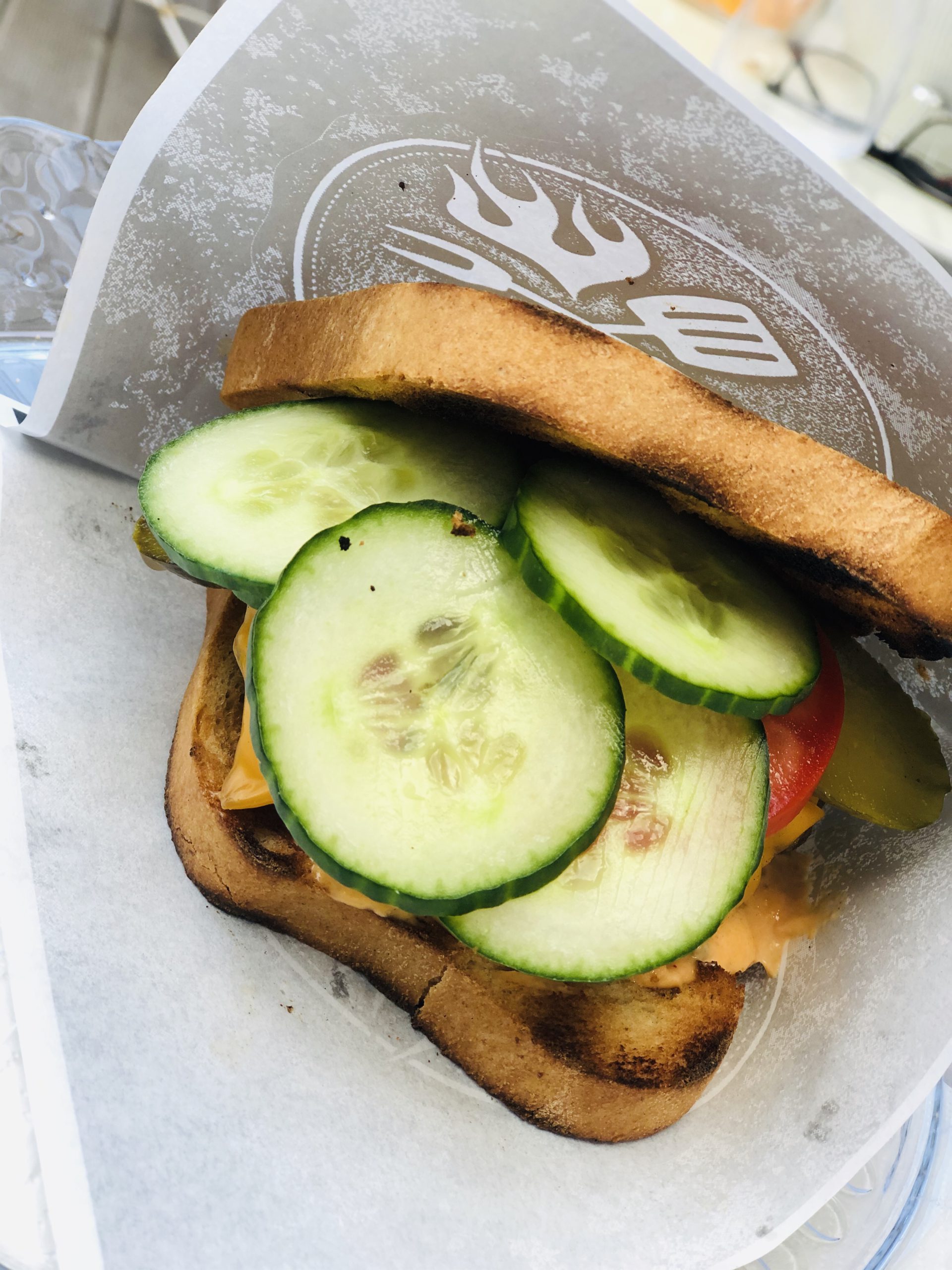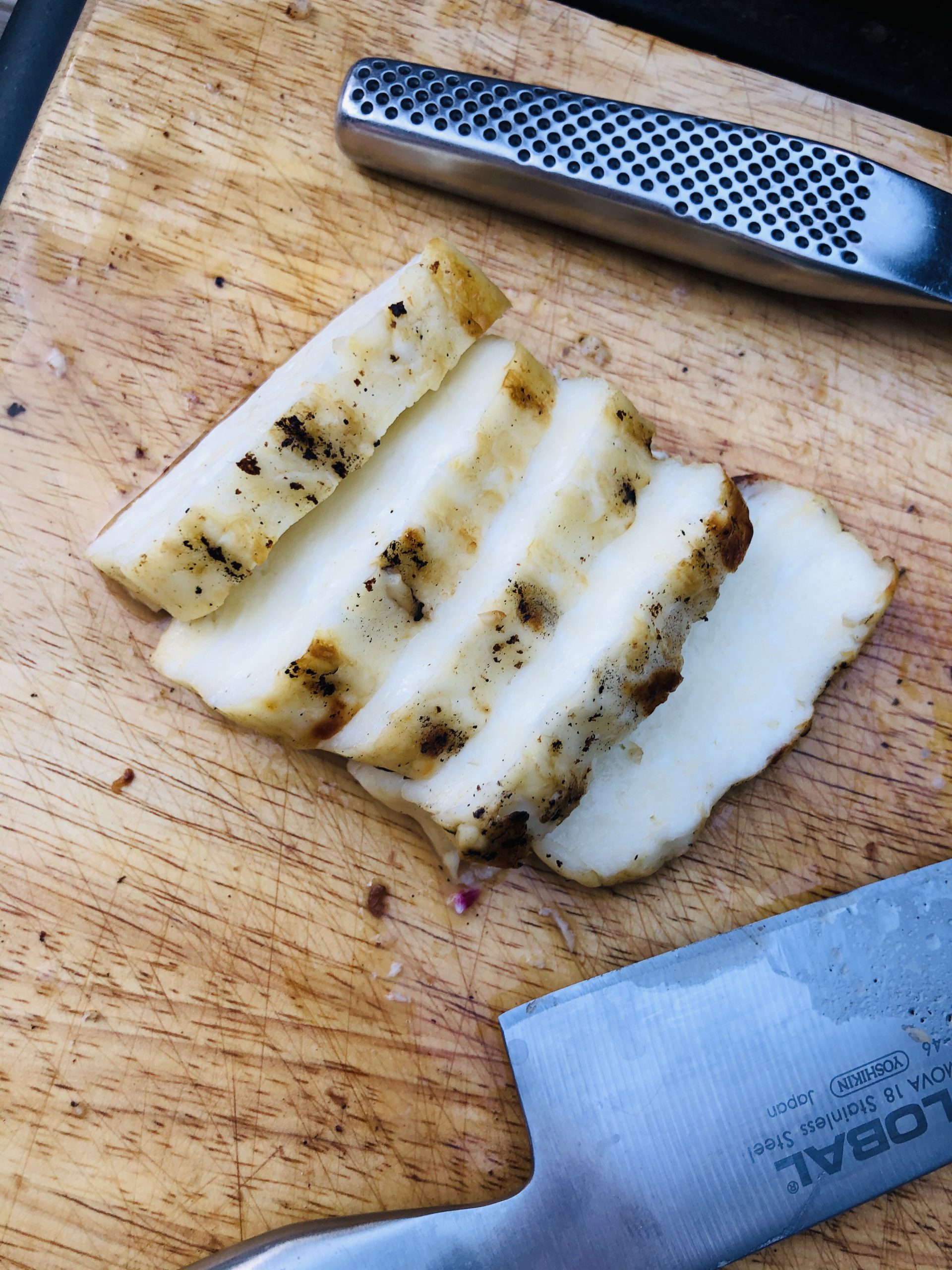 Min hamburgare åt jag med glutenfritt bröd. Ett tips när du grillar halloumi, grilla hela åt gången och skär sedan upp den. Mattias gjorde så och jag som alltid skivat den innan tyckte ju att det här var så mycket smidigare än små tunna halloumisar som trillar ned mellan gallerspringorna.