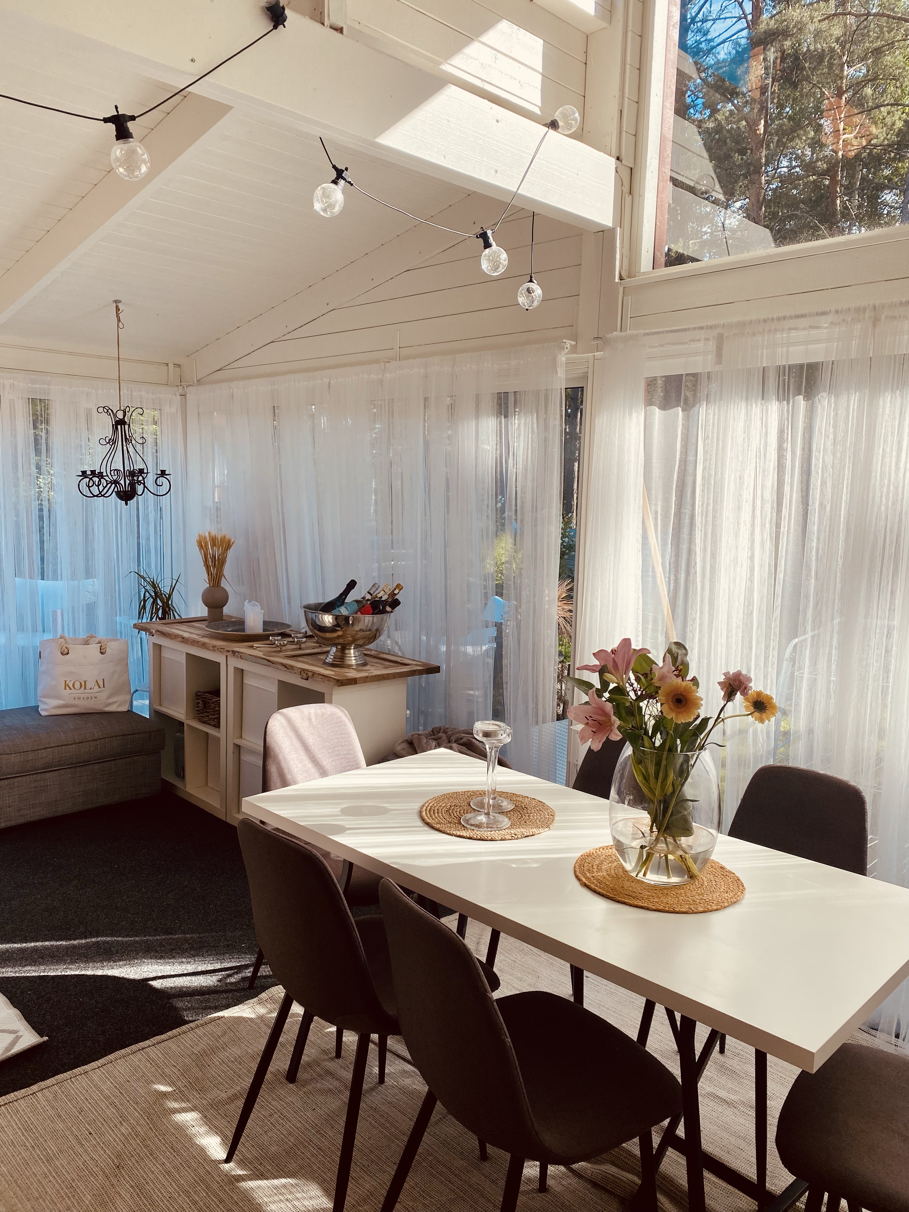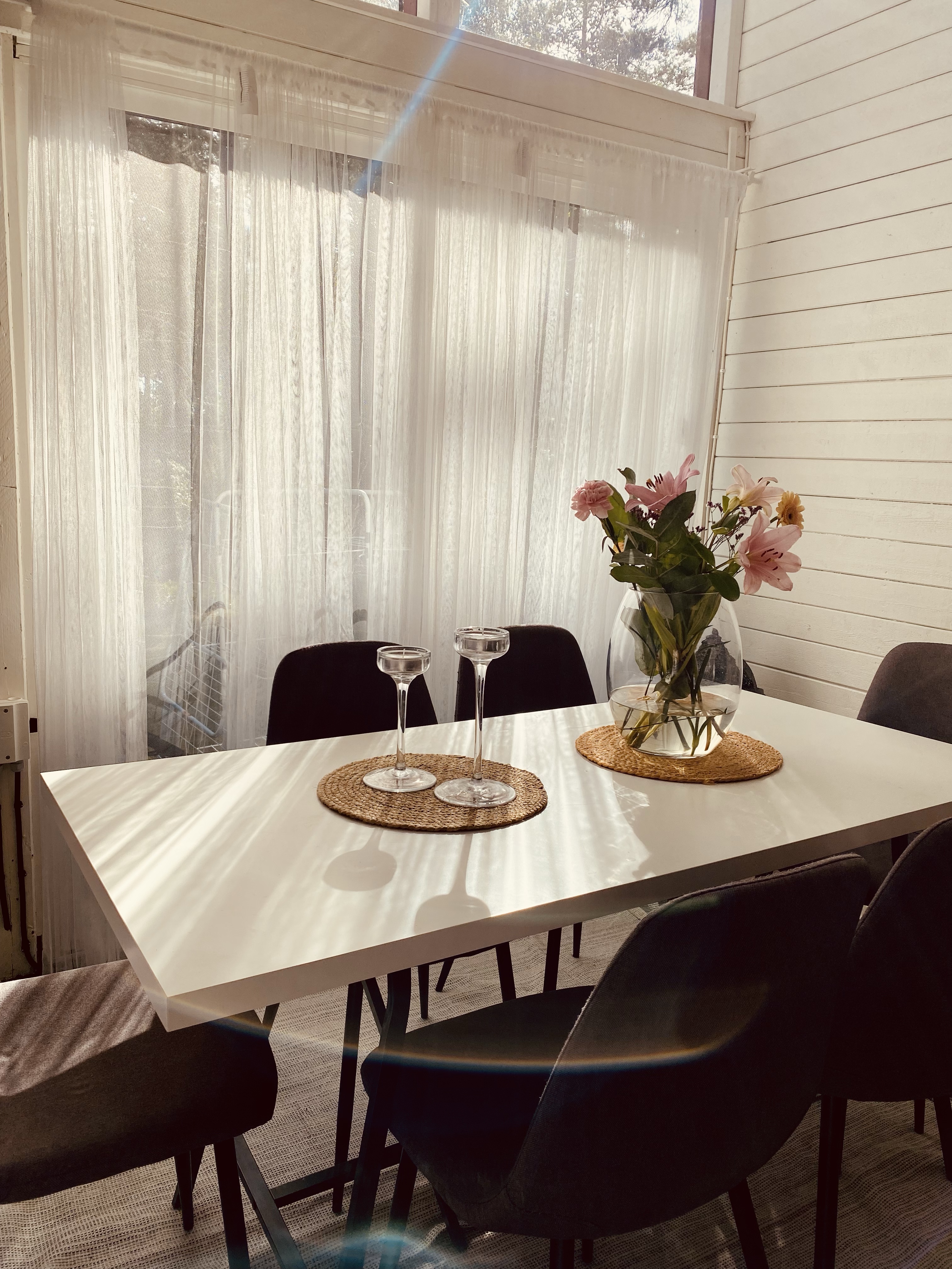 Åh, det finns en stund på morgonen som är så magisk så det är svårt att förklara. Det är på morgonen precis när solen börjar bryta igenom, det är sådär tyst och lugnt fortfarande, man hör allt så ingående. Fåglarna som kvittrar, suset i träden, en dörr som öppnas eller en cykel som susar förbi. Alla de där ljuden som inte hörs när dagens sorl vaknat. Exakt den lugna stunden fotade jag i vårt uterum, det är något så speciellt med just den stunden och jag älskar den verkligen.