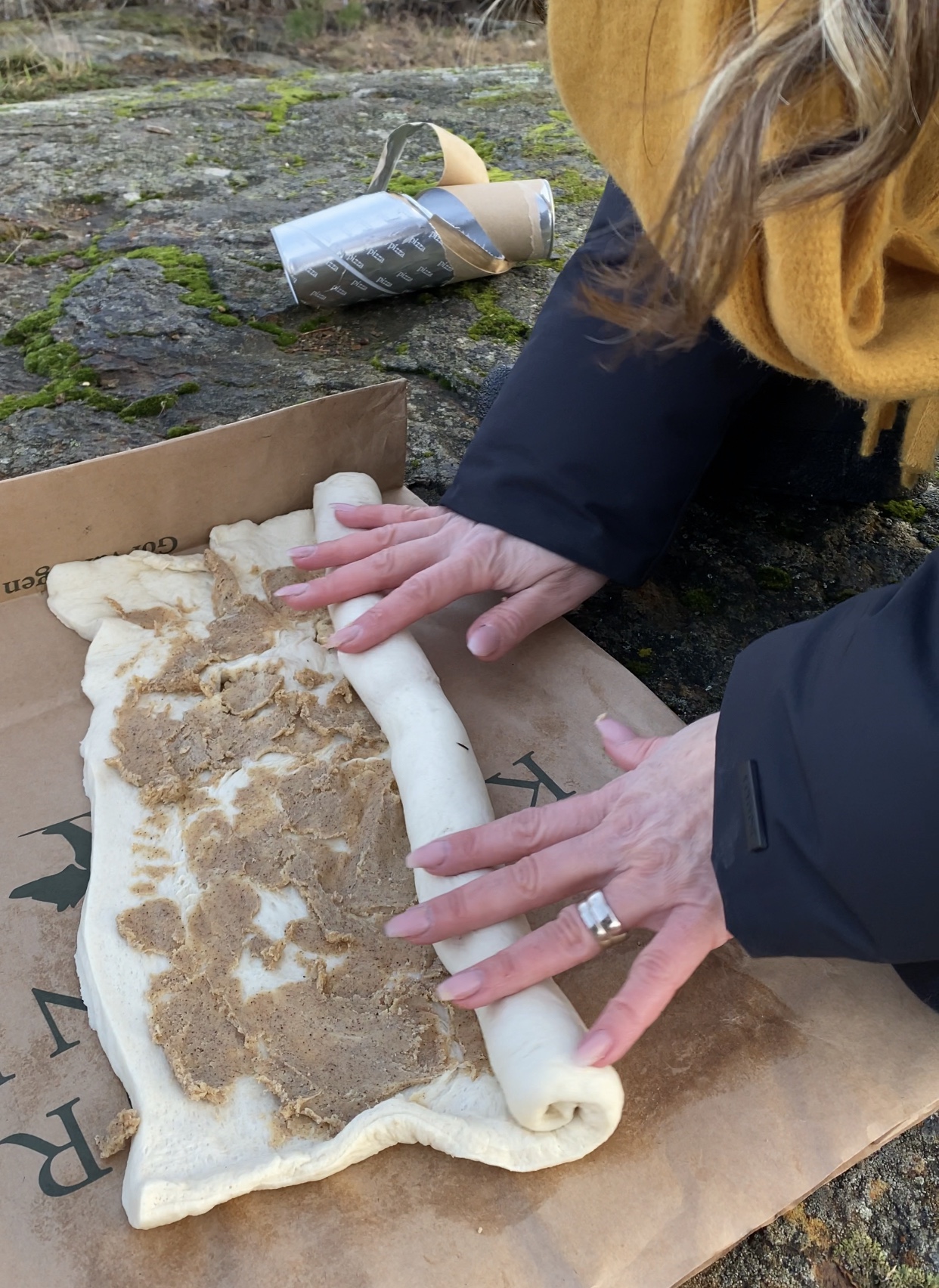 Det är ju så enkelt att svänga ihop. Veckla ut pizzadegen, på med 75 g smör, 2 msk kanel, 1/2 dl socker, 2 tsk vaniljsocker. Blanda gärna ihop det till en röra innan du brer på med på plattan. Rulla ihop från långsidan och skär sedan ca 3 cm breda skivor.