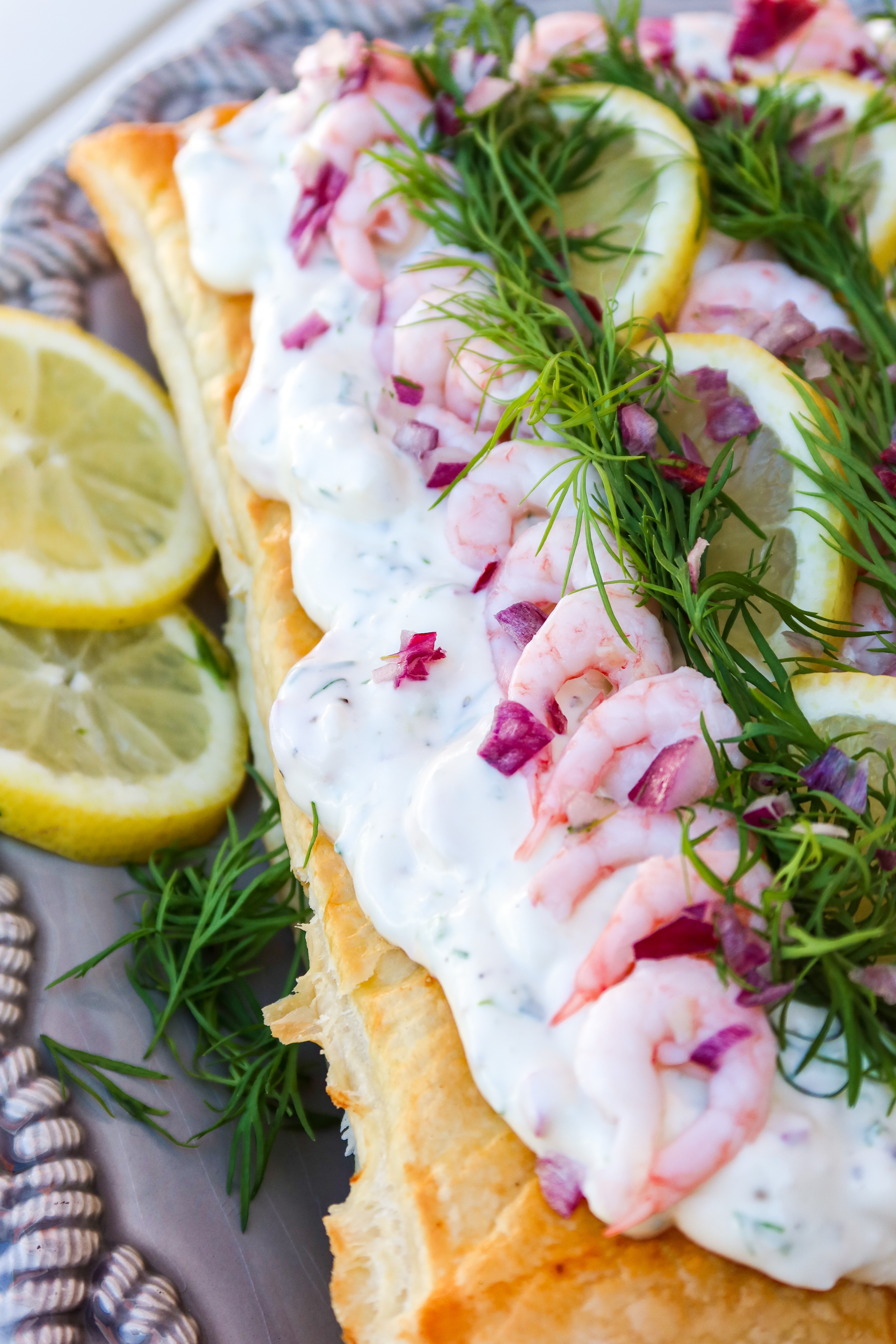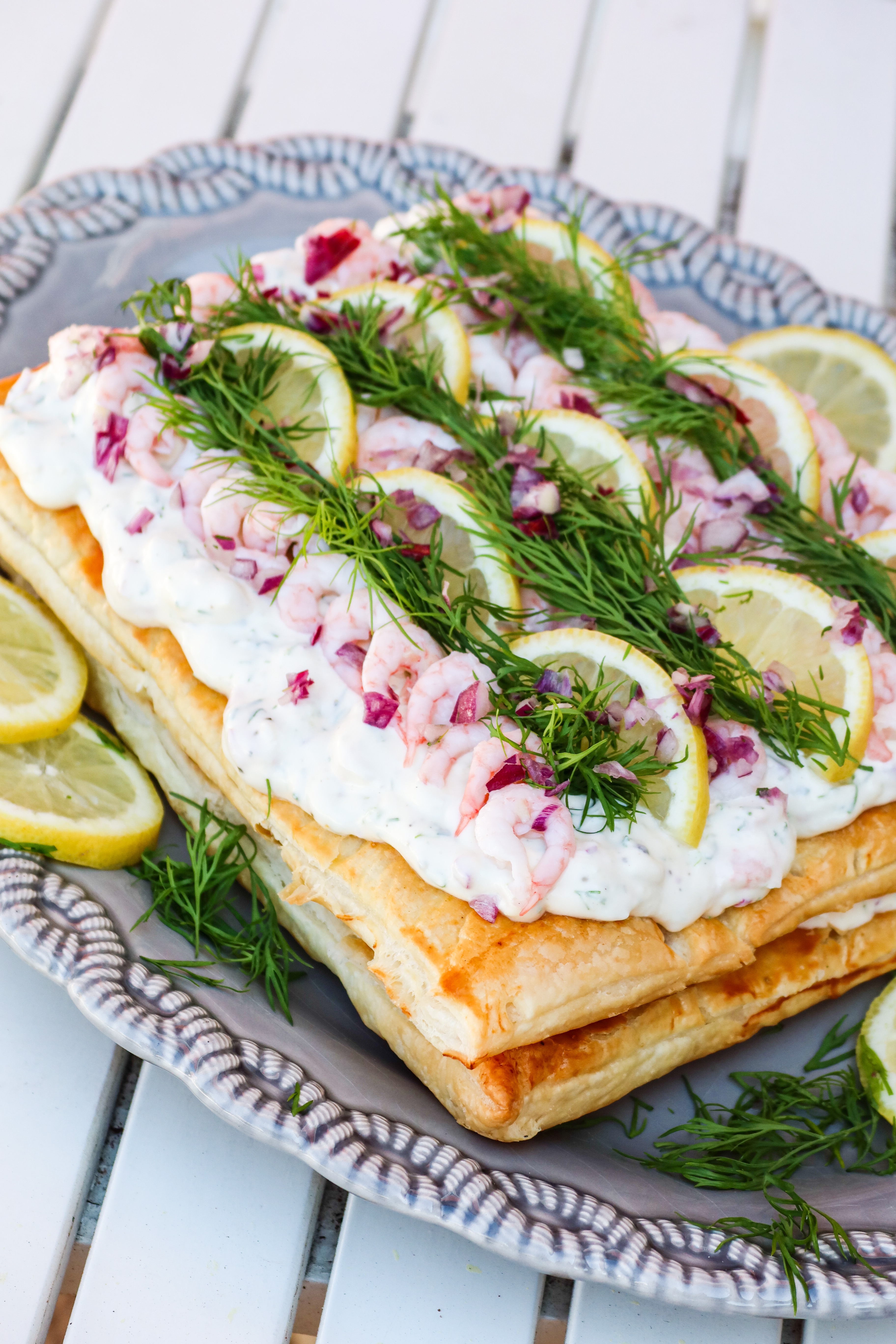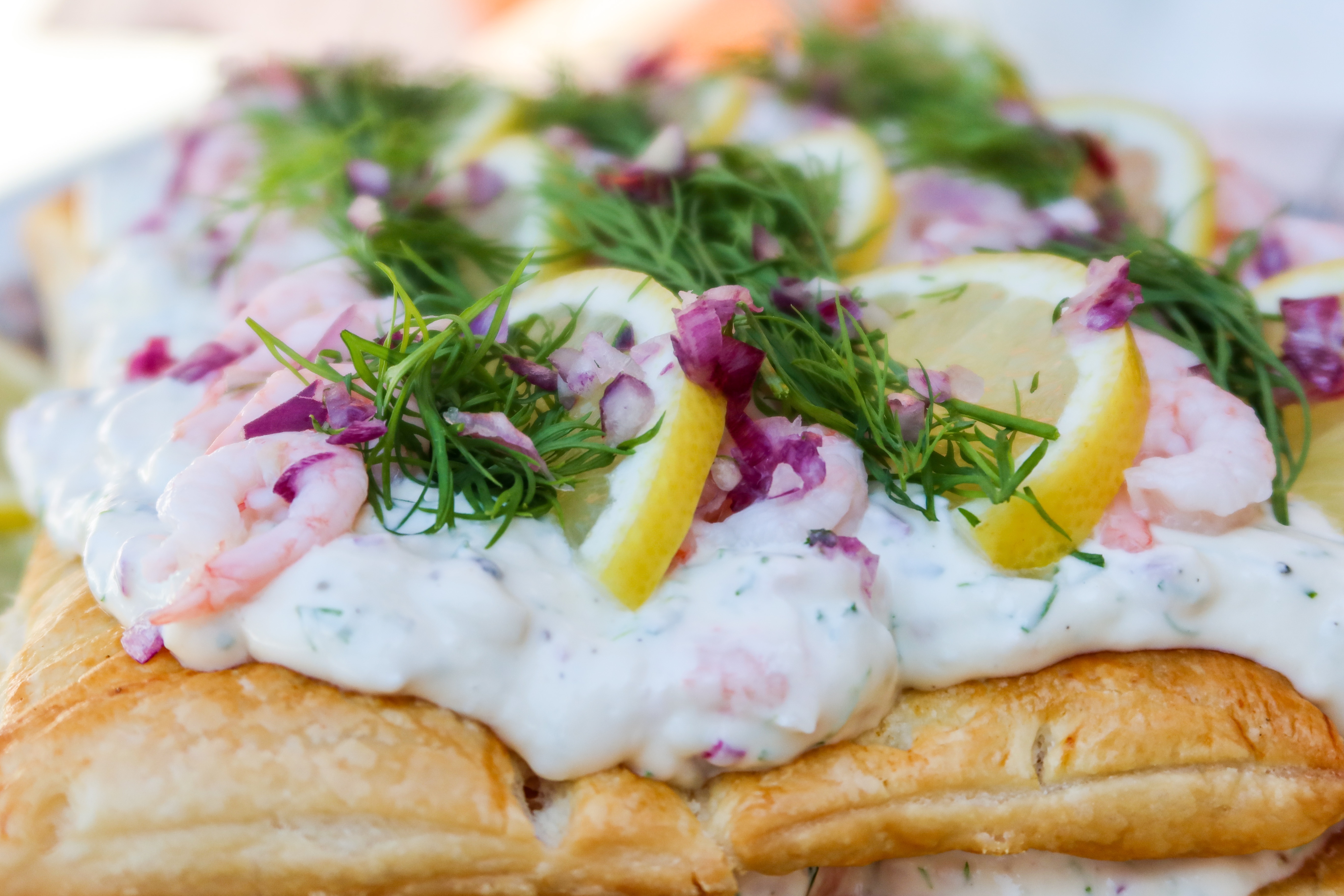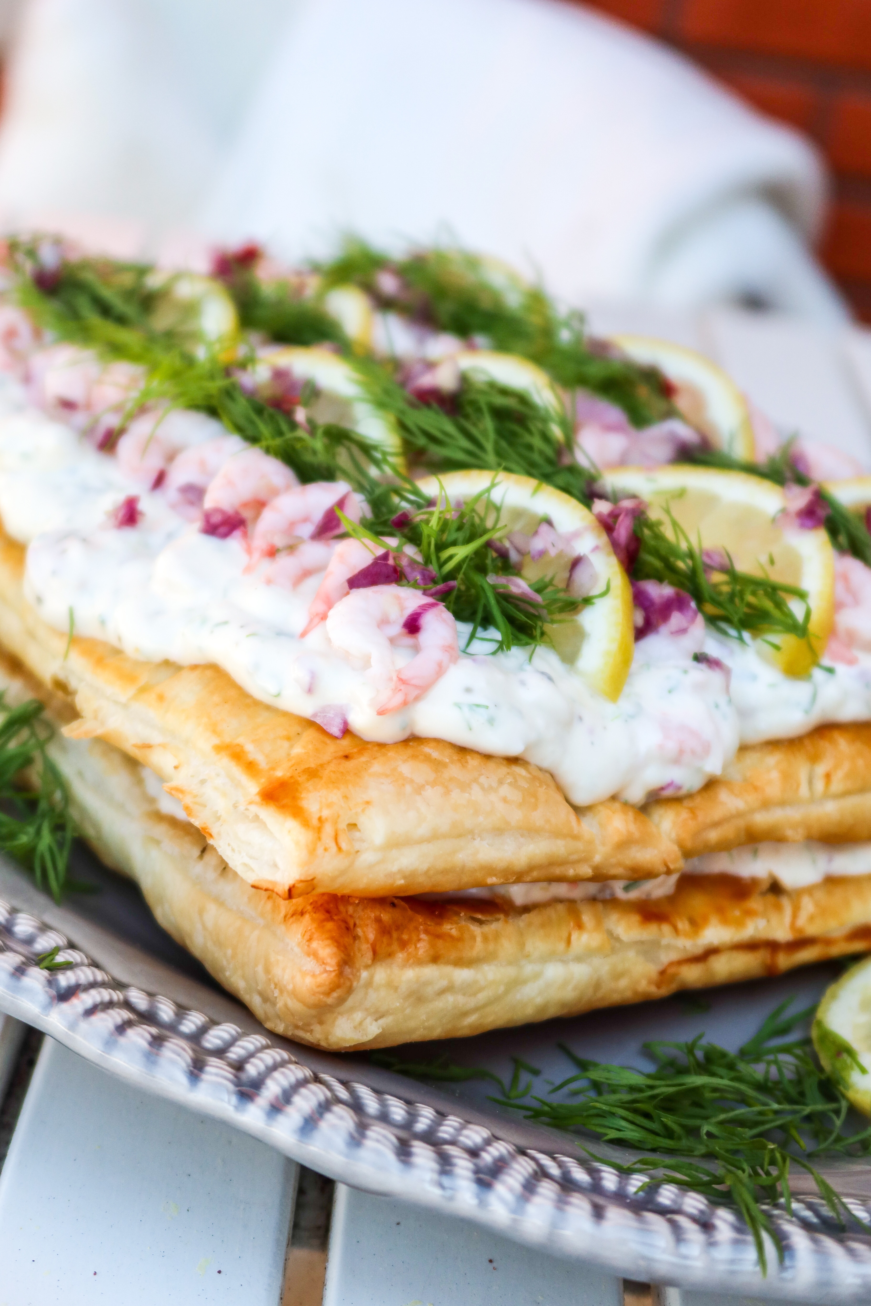 3) På första smördegsrektangeln, bred ut hälften av räkröran. Lägg på den andra rektangeln, bred sedan ut resten på översta smördegsrektangeln. Dekorera.
