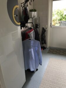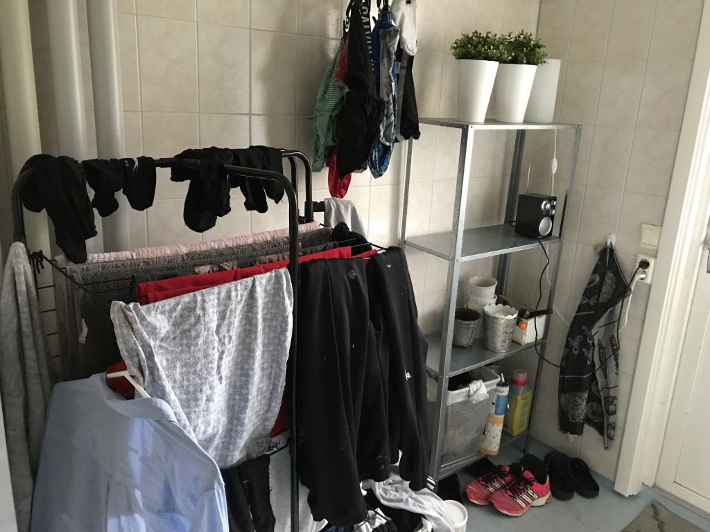 Det första jag skulle göra vara att ”täcka” denna del av tvättstugan. Då kan ni ha kvar torkställningen och den silvriga hyllan där bakom och samla grejer i den.