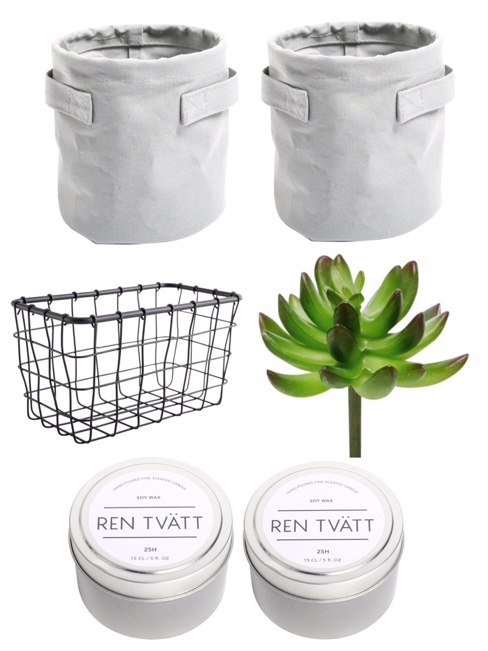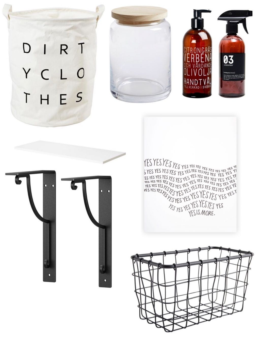 Som du ser på min inspirationsbilder gör det väldigt mycket att sätta upp hyllor. De sväljer mycket, dessutom så är det väldigt snyggt. >>järnkorgarna<< skulle jag fylla med små handdukar och annat som man kan tänkas ha i tvättstugan. Jag skulle också ställa en extra tvål och rengöringsspray på hyllan. En av de gråa tygkorgarna med en >>grön växt<< i skulle jag också ställa där. Inspirationsbilden ger lite tips där.