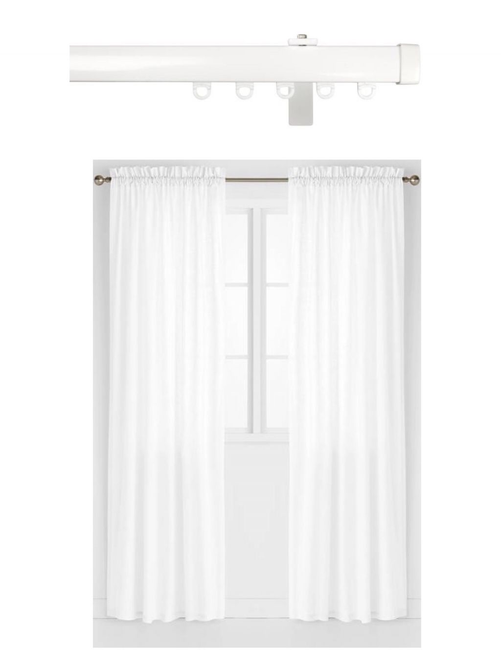 Perfekt då är att använda en >>vita gardiner<<som får hänga från tak ned till golv. Vitt tyg väljer jag för att vi fortfarande vill hålla denna del ljus och inte som en korridor, mörk och trång.
