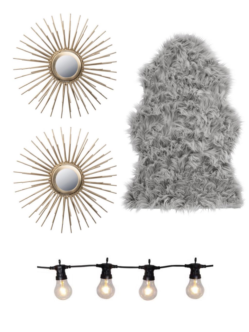 På väggen bakom soffan är det lite kalt. Något på väggarna ger också en varmare känsla i ett rum. Jag föreslår de guldiga >>ljusslingan<< bredvid. Bara en spik eller skruv högt upp på väggen och sedan hänga ned ljusslingan i den. Det kommer ljusa upp mässingsfärgen på speglarna jättefint. Ett jättesnyggt substitut för tavlor.