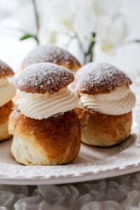 5. Klicka eller spritsa mandelfri mandelmassa i semlan, vispa grädde och spritsa den på semmelbullen, lägg på locket och pudra med florsocker.