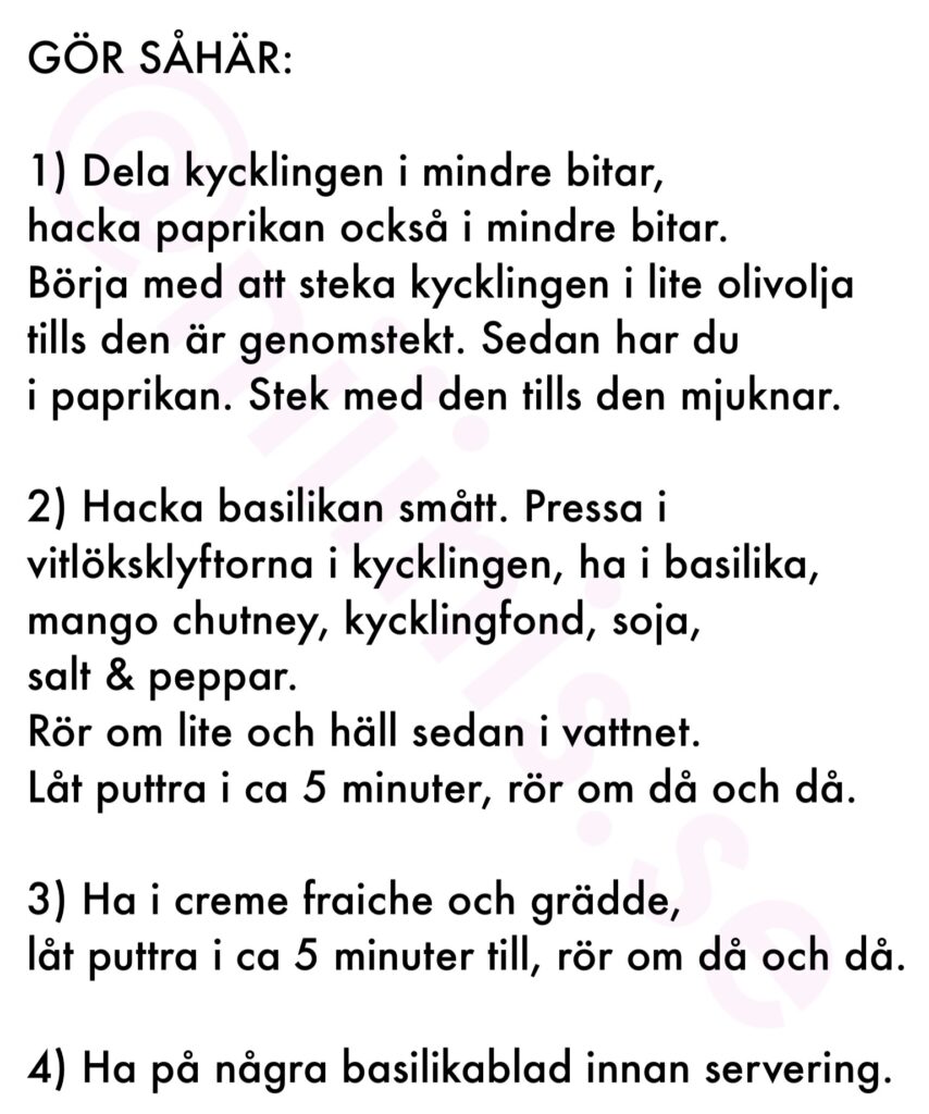 Kul och höra om du testar att laga denna kycklingrätt. Så himla gott! Du kan självklart byta ut kyckling mot t ex fläskytterfilé eller fläskfile också.