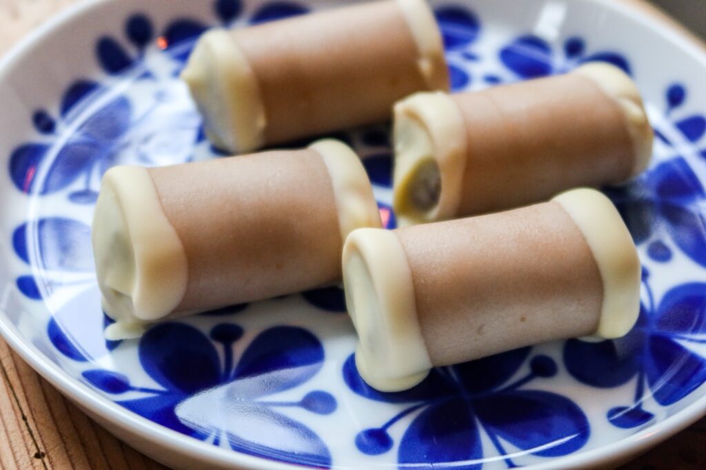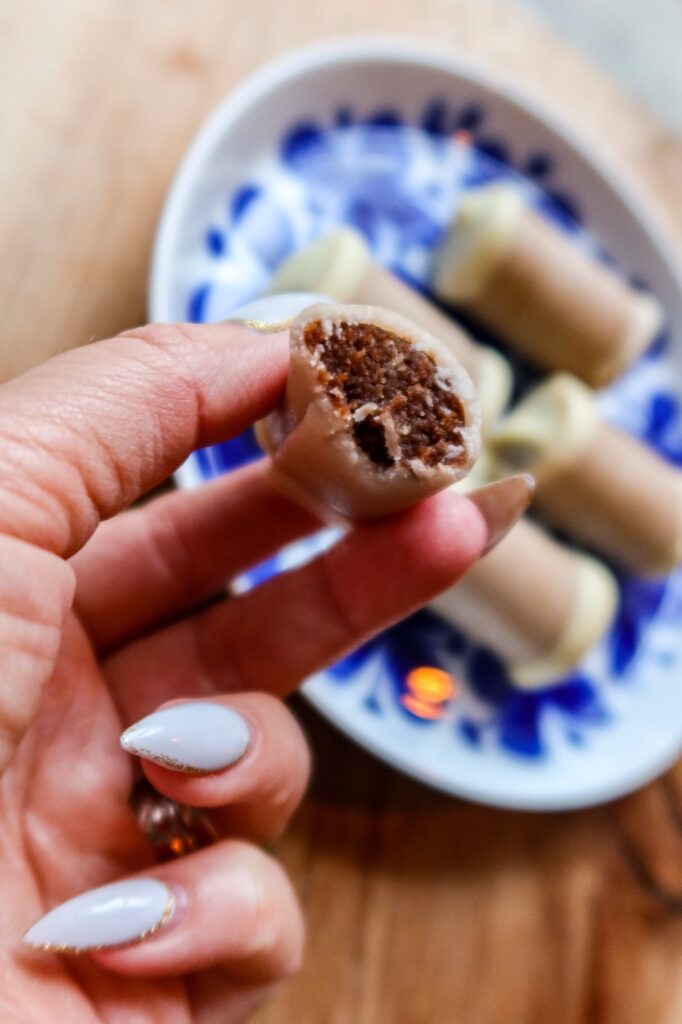 2) Forma till avlånga runda bitar, klä varje bit med marsipan. Gör du den lite långsammare varianten så kan du rulla degen till två lika långa ormar som du ställer i kylen i en halvtimma. Klä rullarna med marsipan och sedan skär du varje i ca 4 bitar.