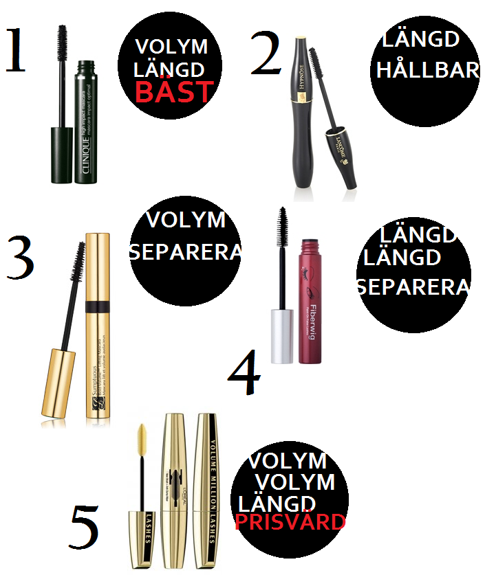 1) CLINIQUE HIGH IMPACT. Korpsvarta fransar med jättefin längd. Håller fransarna separerade och håller bra. Tycker oxå att denna ger fin volym om man har på den flera gånger.