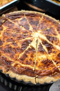 Rör ihop osten grädde och äggen. Häll detta i pajskalet. Ställ in i ugnen och grädda i 25- 35 minuter. Pajen ska få färg, gärna lite dallrig i mitten. Den stannar till när den svalnar och blir sådär krämigt god.