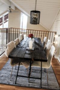 Tanken är att bordet på loftet bara ska användas när det är mycket folk som vid t ex kalasbjudningar, då hämtar alla ändå sin mat och fika på nedervåningen. Har vi middagsbjudning och vi blir fler än 6 stycken ska det finnas ett bord som tar mer folk. Å det händer ju inte jätteofta så då får vi helt enkelt springa ett par ggr extra i trappan. 🙂