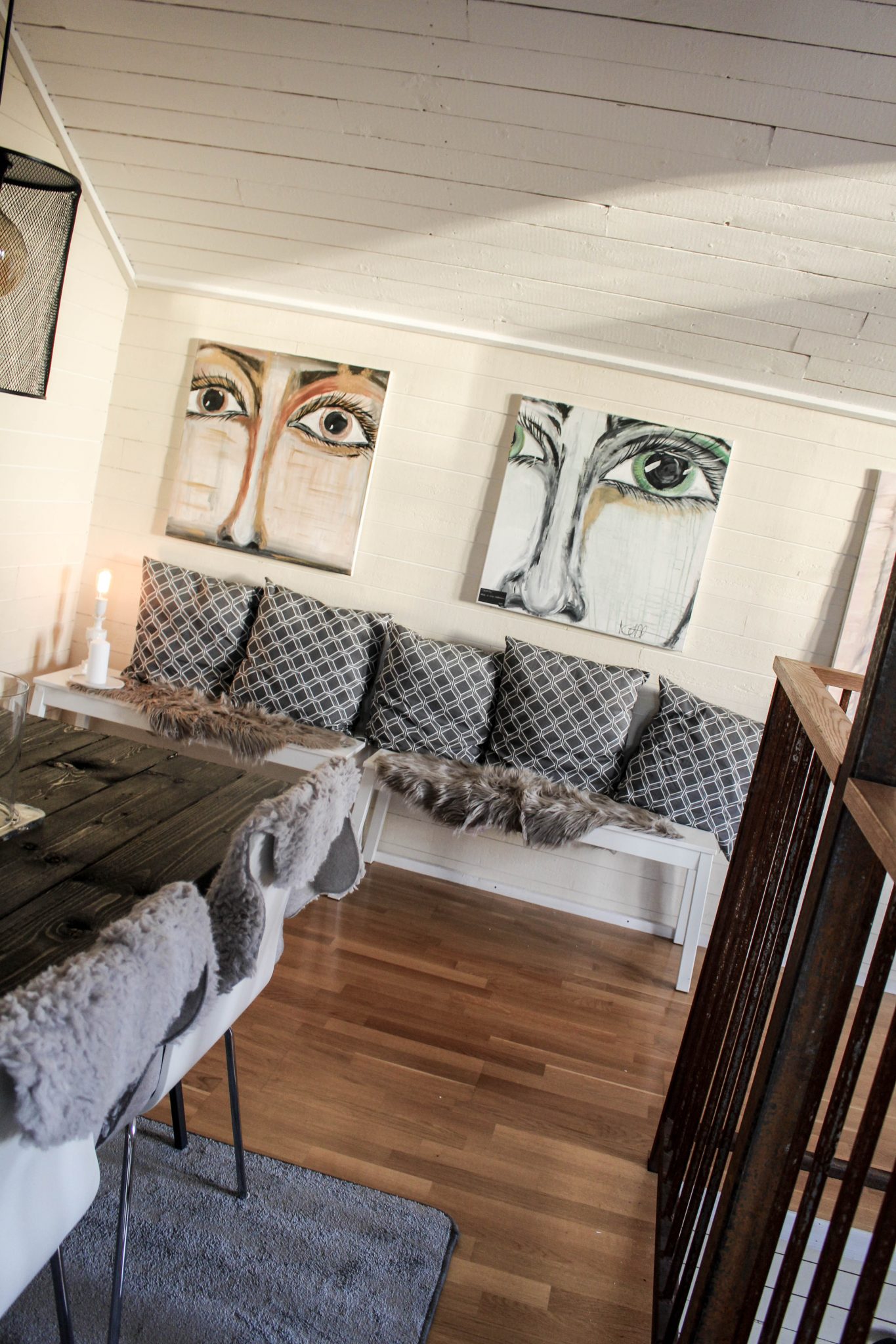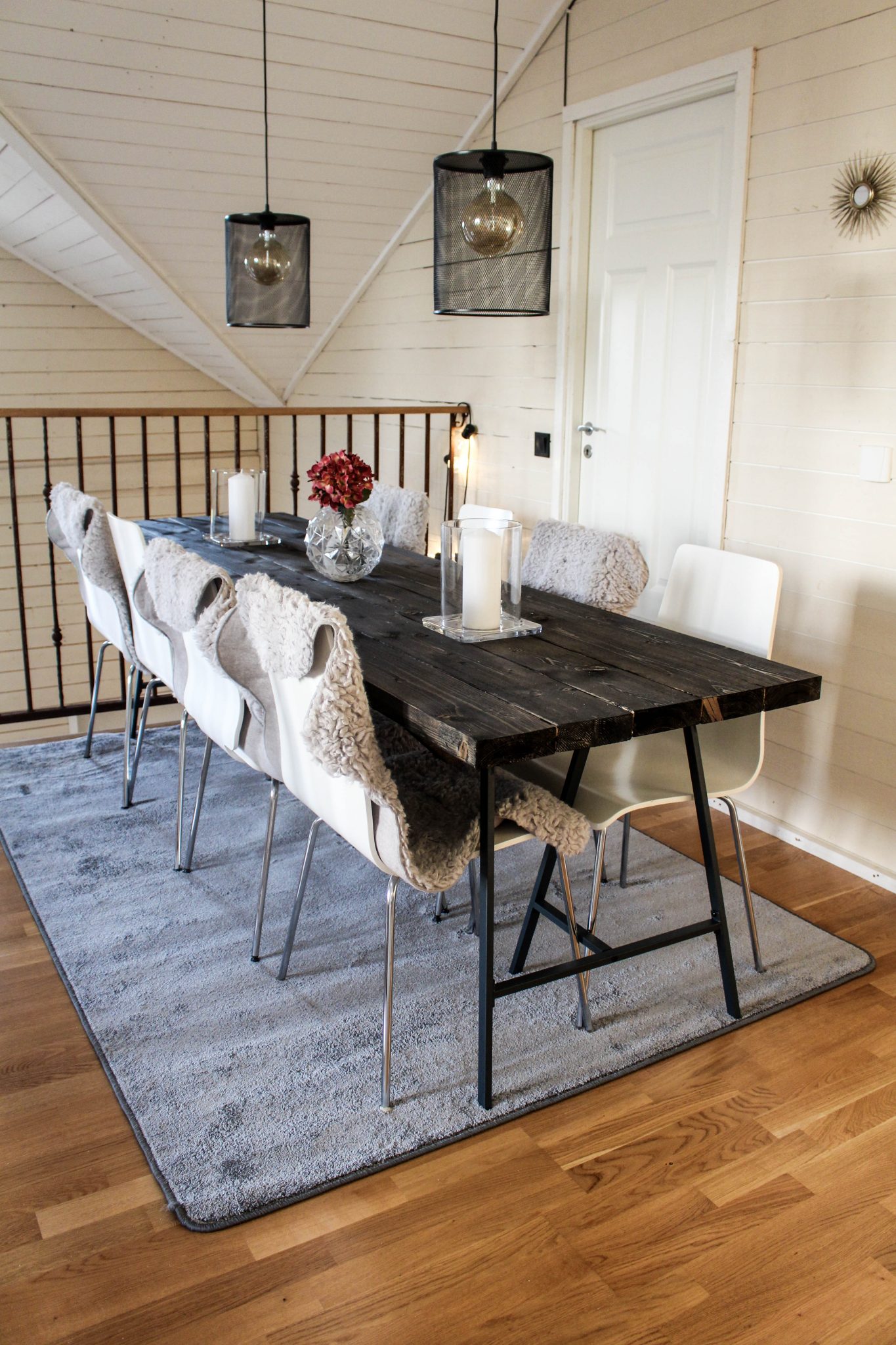 Den jäkla mattan då. Grejen är att jag ju älskar den, som fan. MEN, den passar inte. Varken till bordet eller ”fårskinnen” på stolarna. Jag måste placera den någon annanstans och så blir det en ny matta helt enkelt. Tror faktiskt att jag vill ha en ryamatta här. Det känns som det är den känslan jag vill ha på det här loftet.