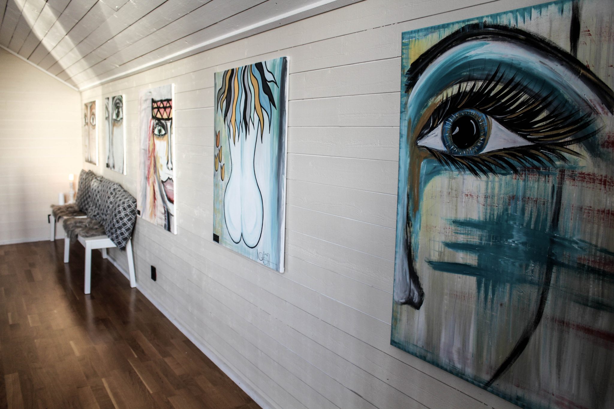 Det är också här uppe på loftet som mina tavlor hänger nu, eller några av dem. Jag har en nere och resten i förrådet. Väggarna räcker inte till… Haha. Dessa tavlor är från tidigare. Nu har jag en helt annan stil helt plötsligt, väldigt intressant det där med konst och hur man känner. Nu är det mycket mer abstrakt och sånt. Ja ni såg ju ängeltavlan. Får se om det är spåret det kommer fortsätta på, vi får se? Man sätter aldrig några begränsningar för sig själv och det ska man nog inte göra heller.