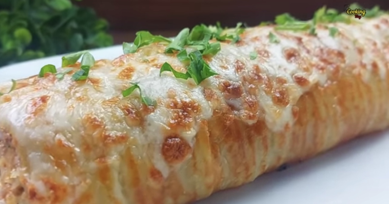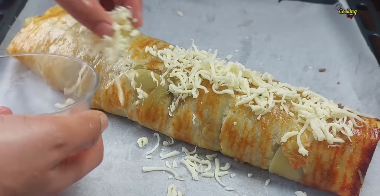 4) Ta ut potatisen och fördela ut köttfärsröran över. Toppa med den rivna osten. Rulla sedan ihop detta till en rulle.