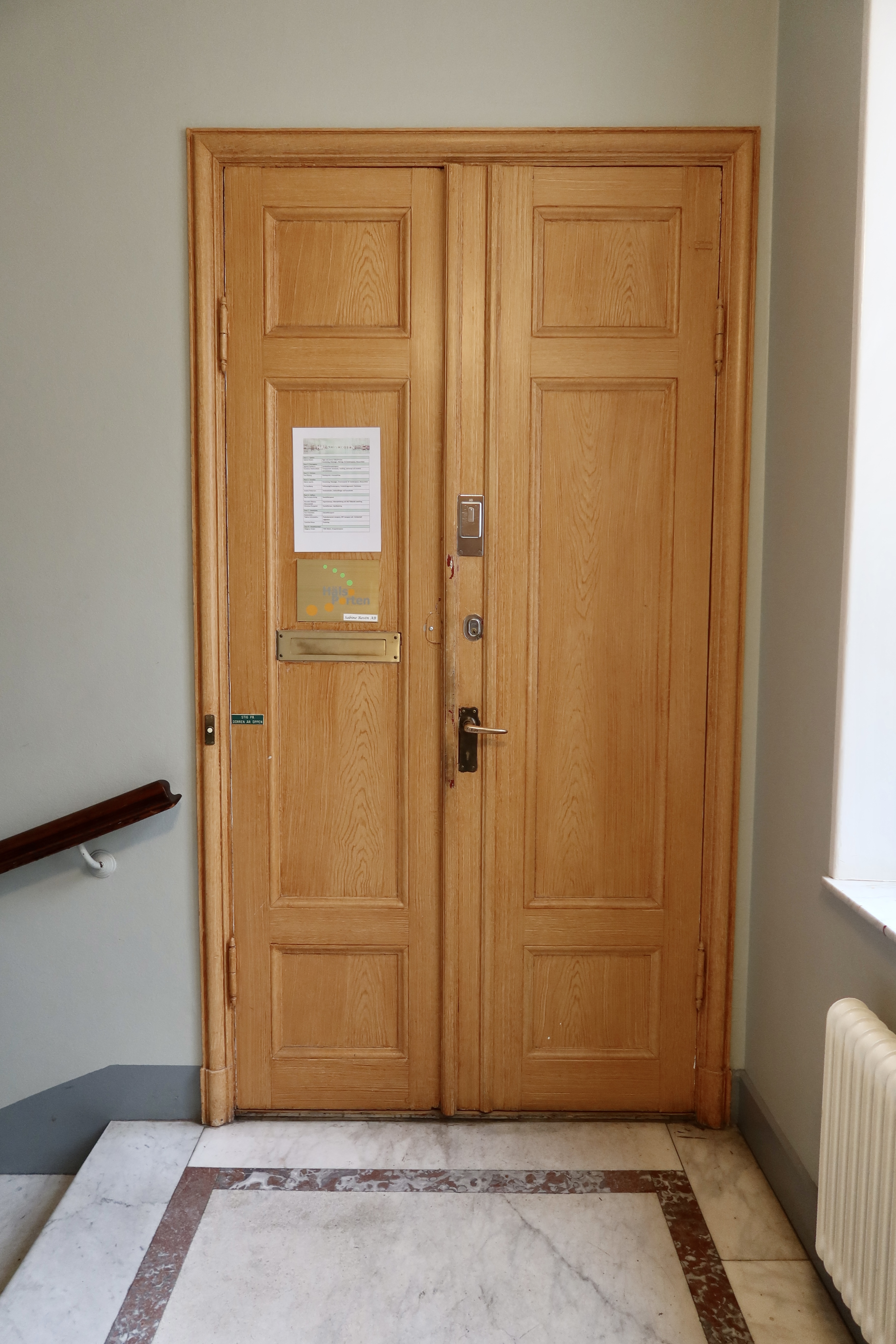 Kameran fokuserade på den vackra hissen istället för mig, jag förstår den, så vacker hiss ju. Här stod jag och väntade utanför, hon har sin mottagning på Odenplan. Jag har en förkärlek för trappuppgångar från sekelskiftet. Alltså de stora breda låga stentrapporna, de djupa fönstren som oftast är så himla vackra. Den uråldriga hissen. Ja men så himla vackert ju.