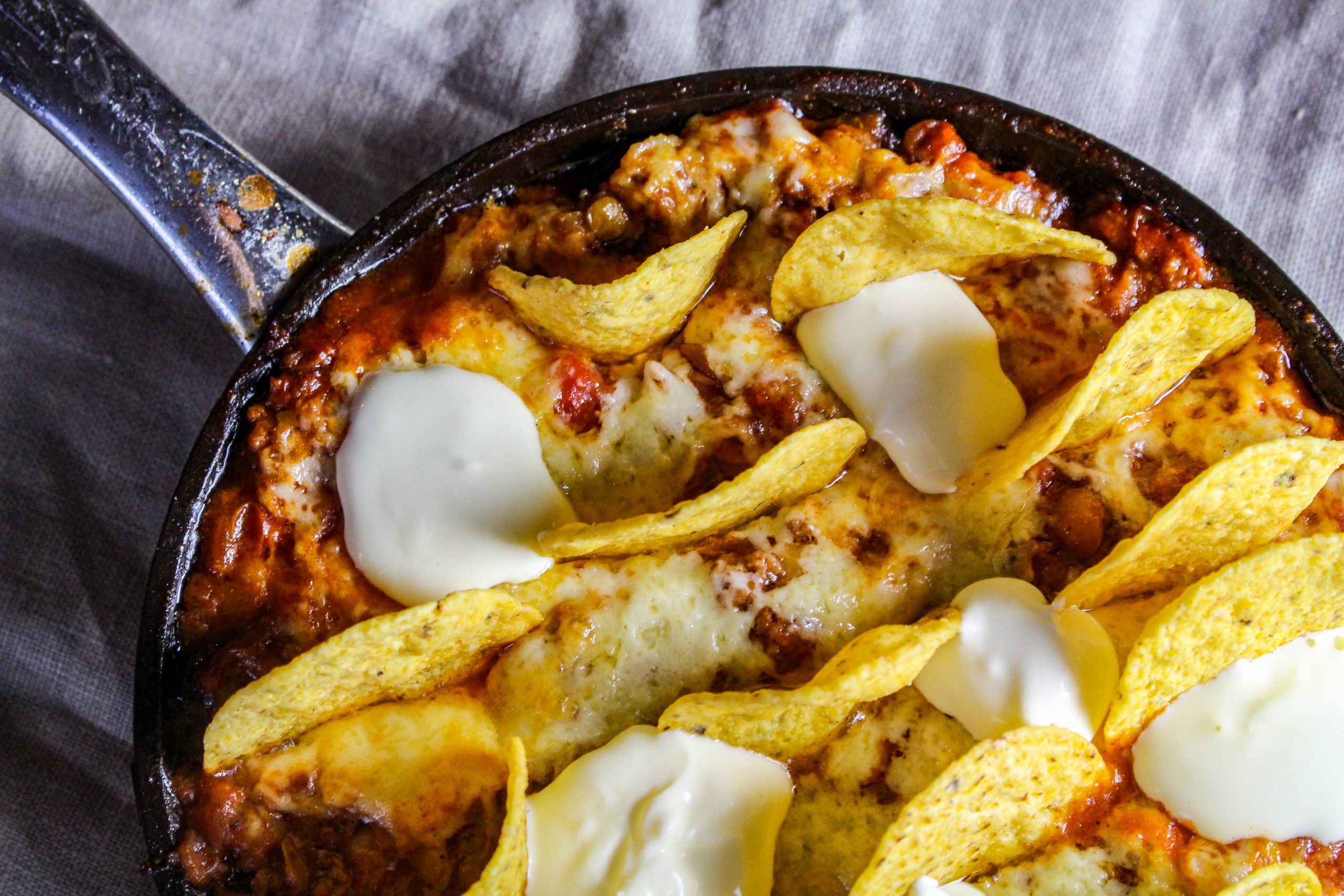 nachoschips, riven ost och creme fraiche till topping