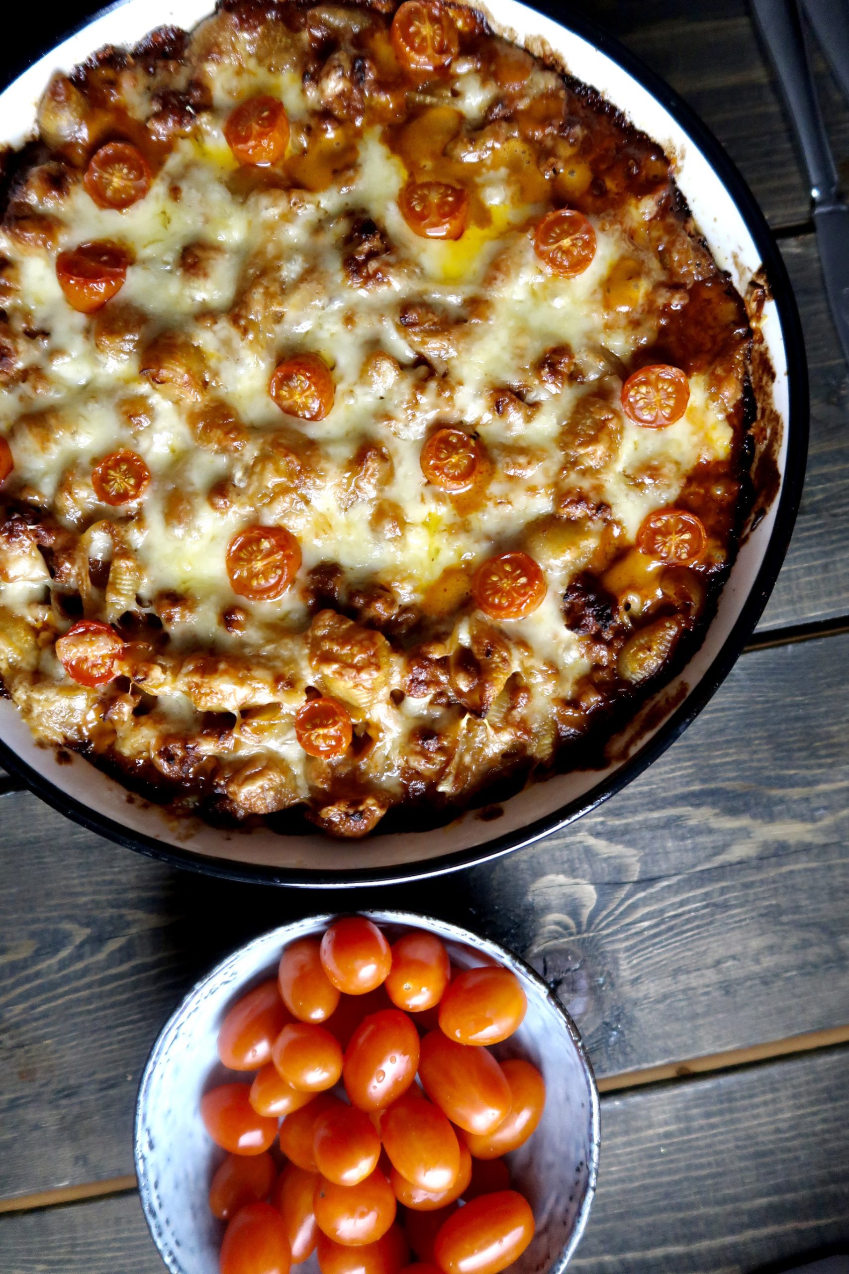 4) Häll i pasta och kycklingfärsen i en ugnsfast form. Blanda runt. Fördela ut den rivna osten och några cocktailtomater. Tillaga i mitten av ugnen i ca 20 minuter eller tills osten fått fin färg.