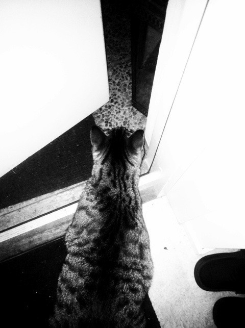 Katten vill ut efter den ätit. Här står jag alltid halvnaken och balanserar så ingen av grannarna ska se in. 🙂