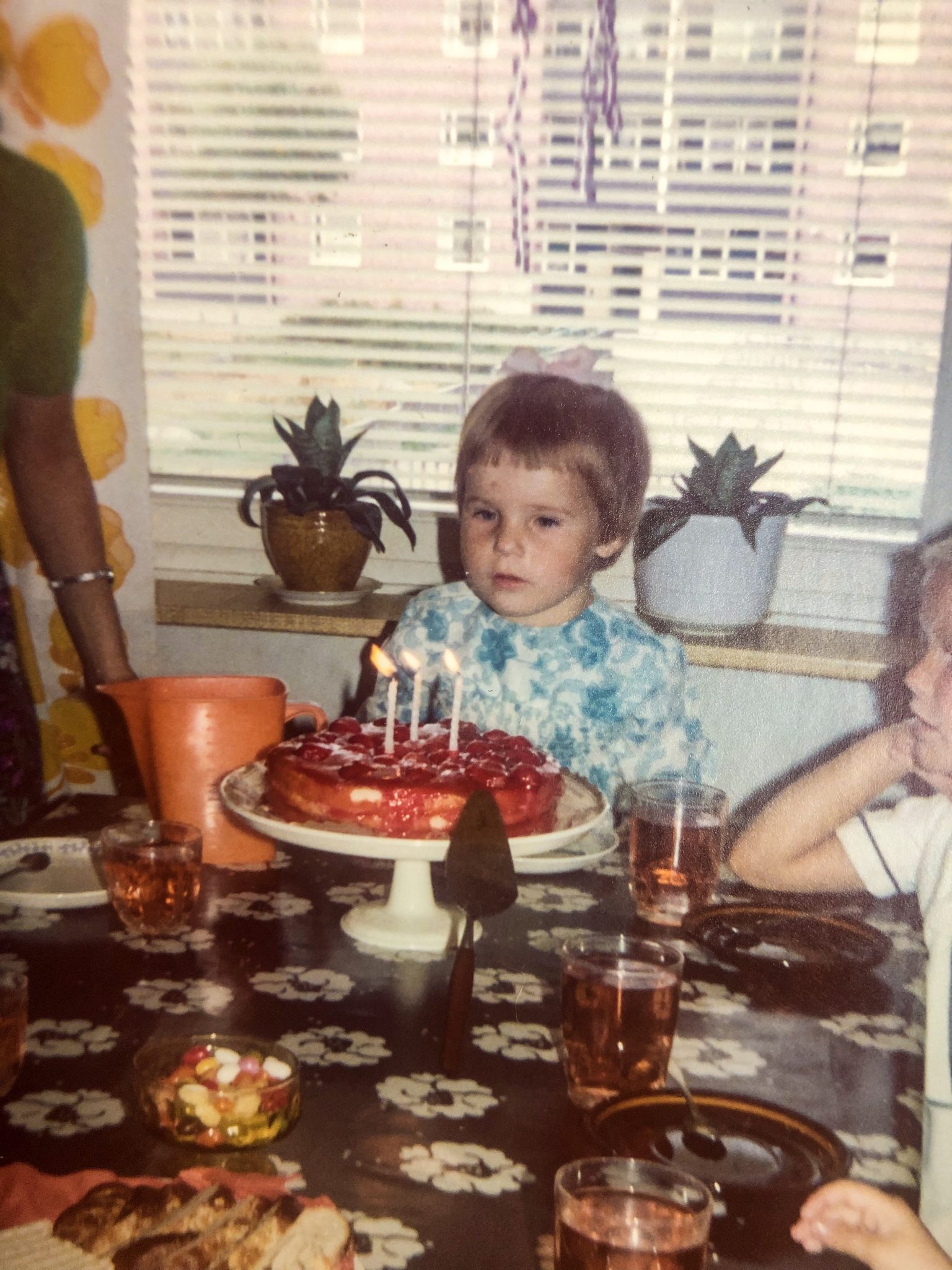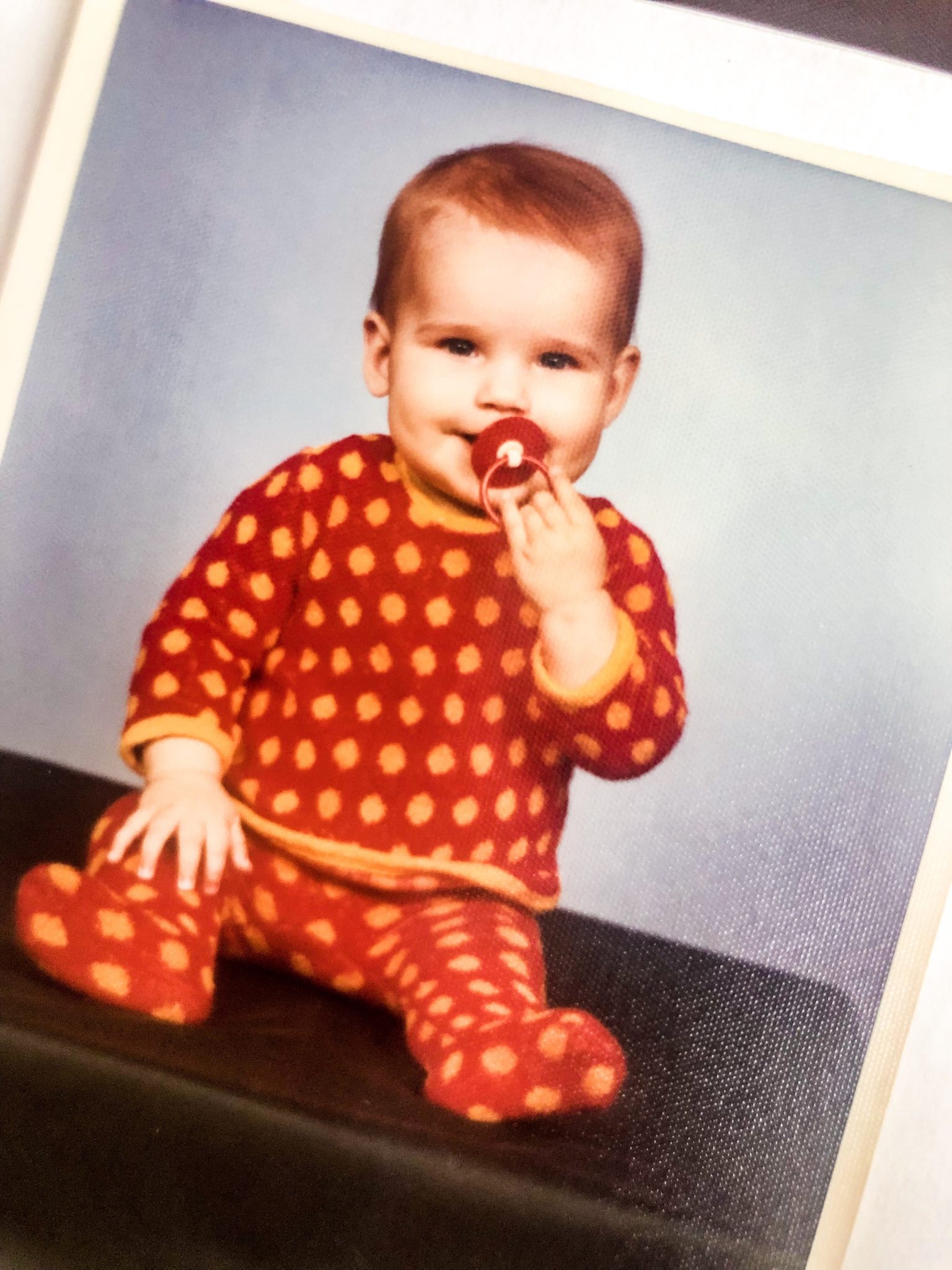 En liten Nina. Jag var finurlig redan då berättade mamma och pappa. Syns på ögonen på något sätt.