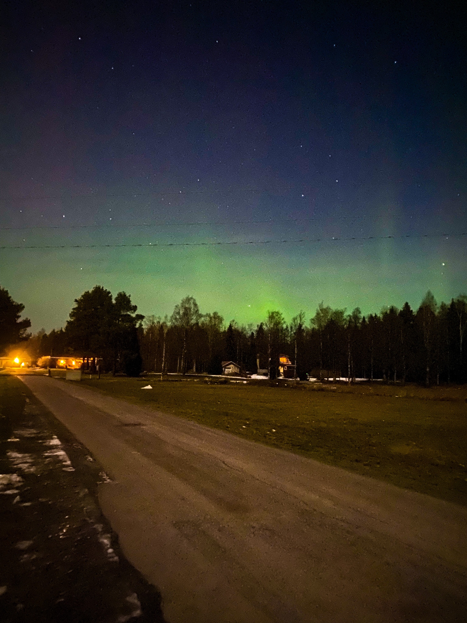 Plötsligt skriver Mia en tjej jag känner att dom sett nere vid sig, vi bor inte långt ifrån. Tony och jag klädde på oss och gav oss ut. Långt bort, svagt svagt kunde jag se att det skiftade grönt. Men det var för ljust. Vi kastade oss i bilen och gav oss iväg. Där på en mörk väg så sken det plötsligt upp, fick tips om att titta på det genom kameralinsen på telefonen. Jag skrek rakt ut när jag kunde ana det.