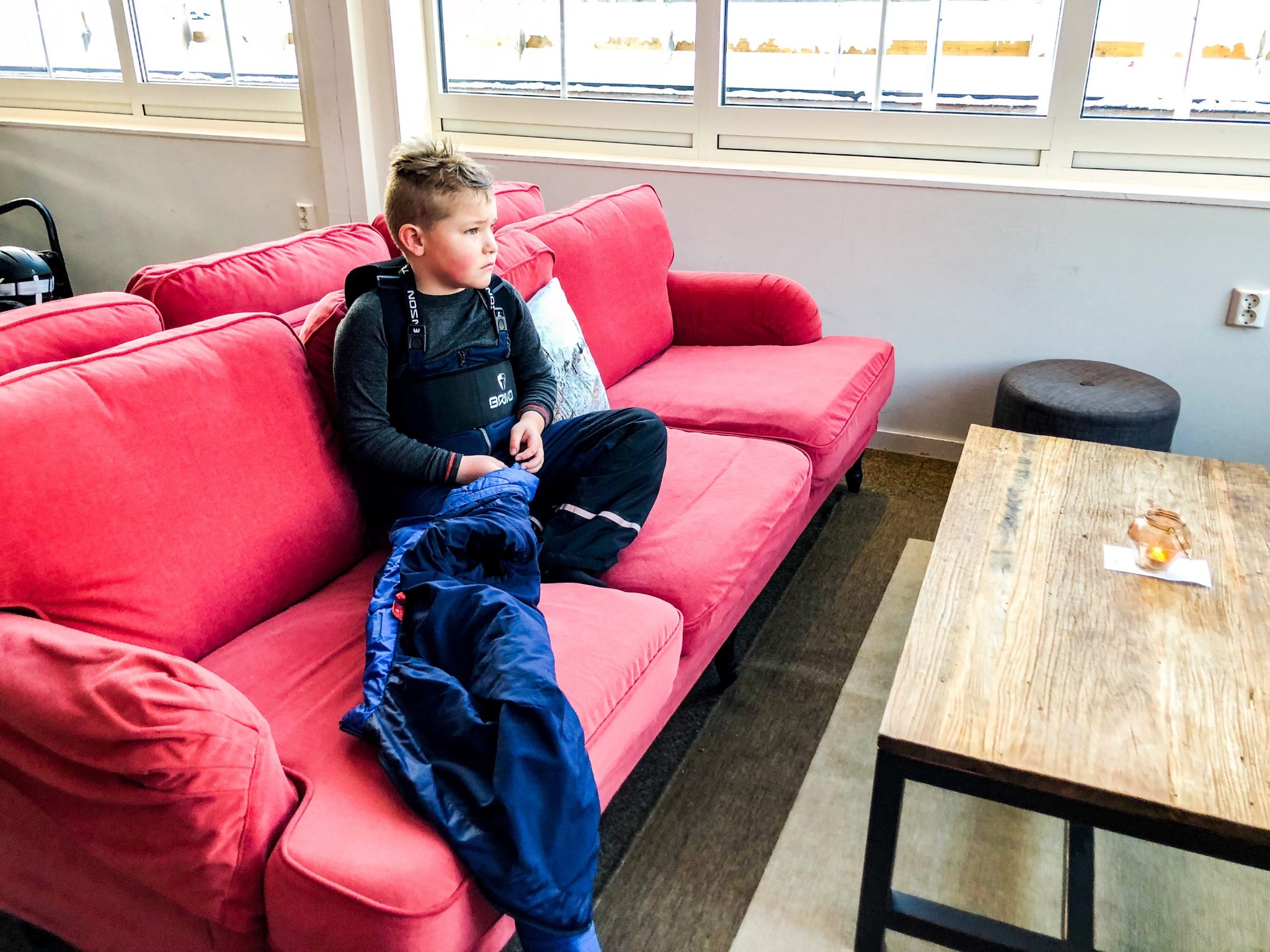 Vi satte oss för lite fika och varm choklad i denna fina soffa. Jag njuter så mycket av att se Milo njuta av skidåkningen och uteliv här. Som här där han satt med röda kinder och drack sin varma choklad och mös. Långt bort från TV-spel, nermysad i en rosa soffa och så jäkla glad och lycklig!