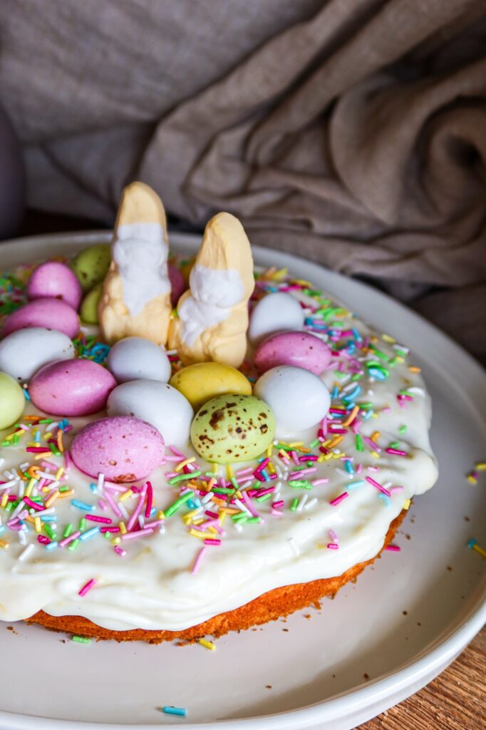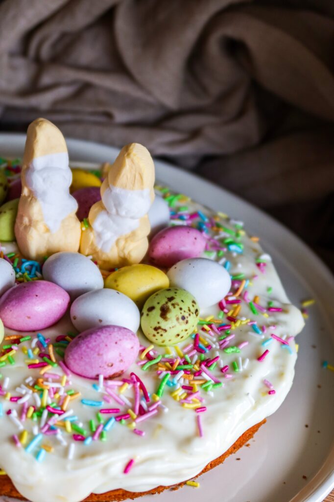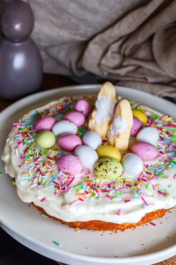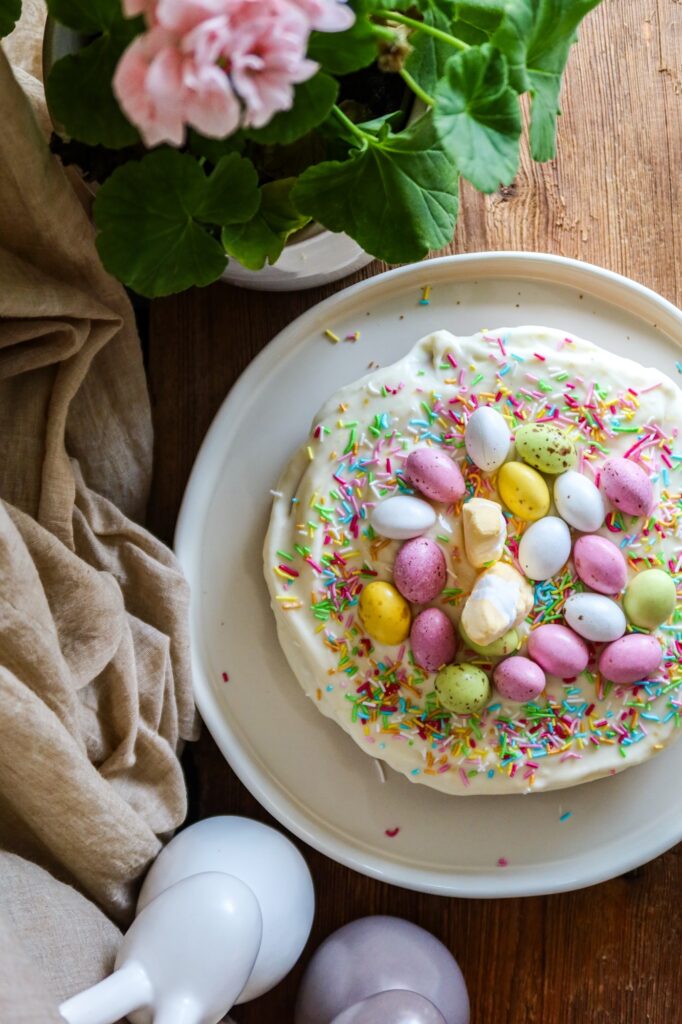 Bred frostingen över den svala kakan och dekorera med påskgodis – gör det gärna lite lekfullt med färgglada chokladägg och strössel!