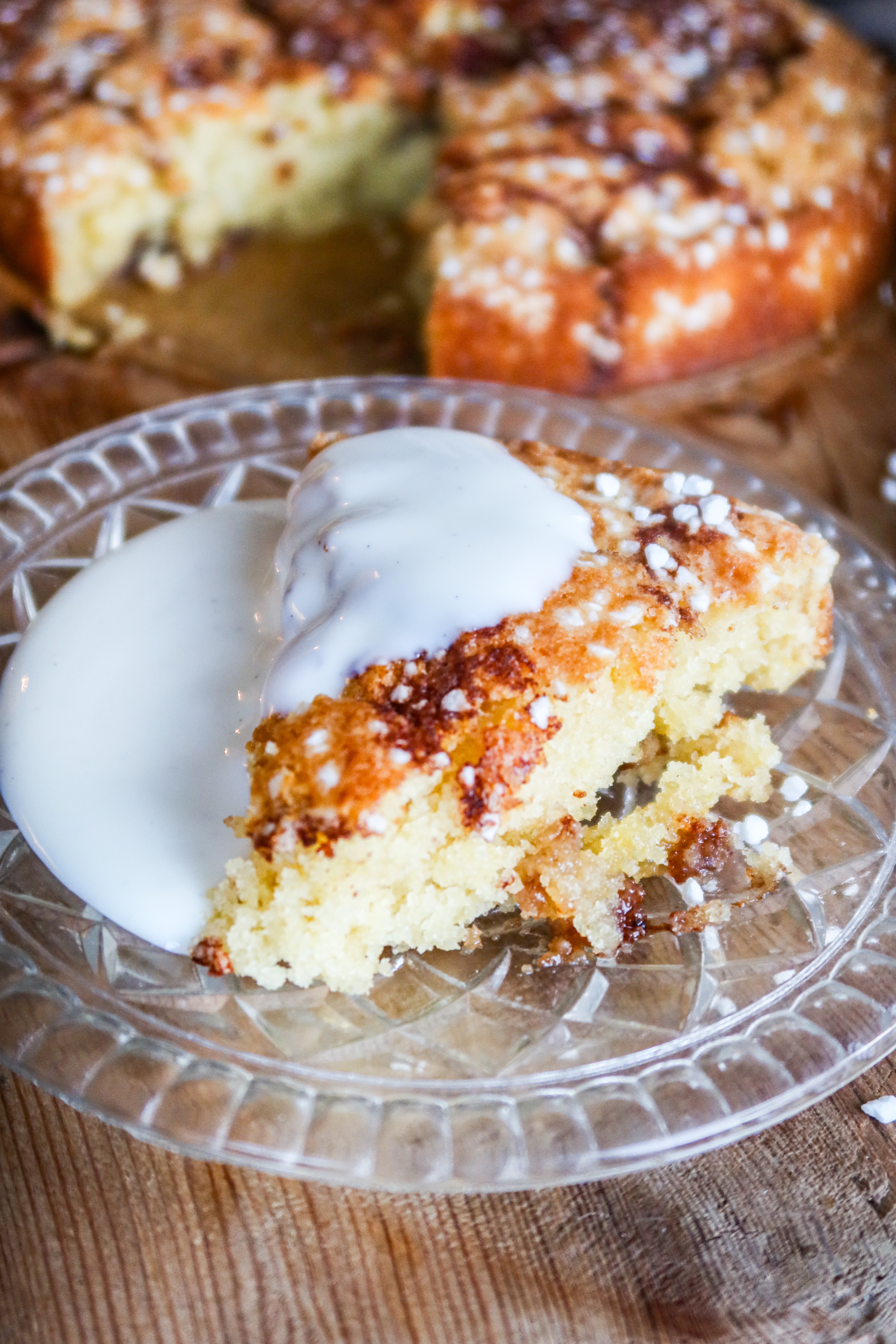 5) Blanda smält smör, råsocker, kanel, kardemumma och vaniljsocker. Ha i det i en spritspåse eller en vanlig fryspåse som du klipper ett litet hål i. Ringla detta över kakan. Toppa med pärlsocker.