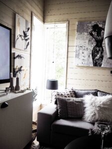 Några förändringar blev det ändå. Flyttade schäslongen åt ”rätt håll” nu och så drog jag ut soffan från väggen en bit. Det ger ju ett mer luftigt rum bara att dra ut den sådär en 40-50 cm. Sedan satt jag upp mina tavlor på väggen också.