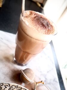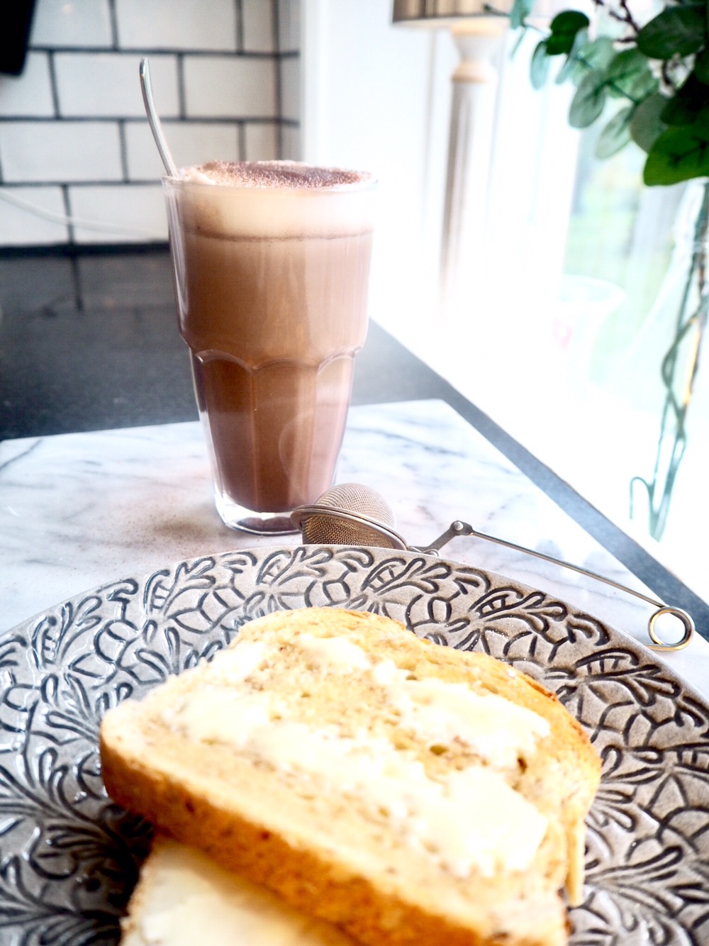 Milo fick varm choklad med skummad mjölk och pudrad oboy på med rostad macka. Han äääääälskade det!