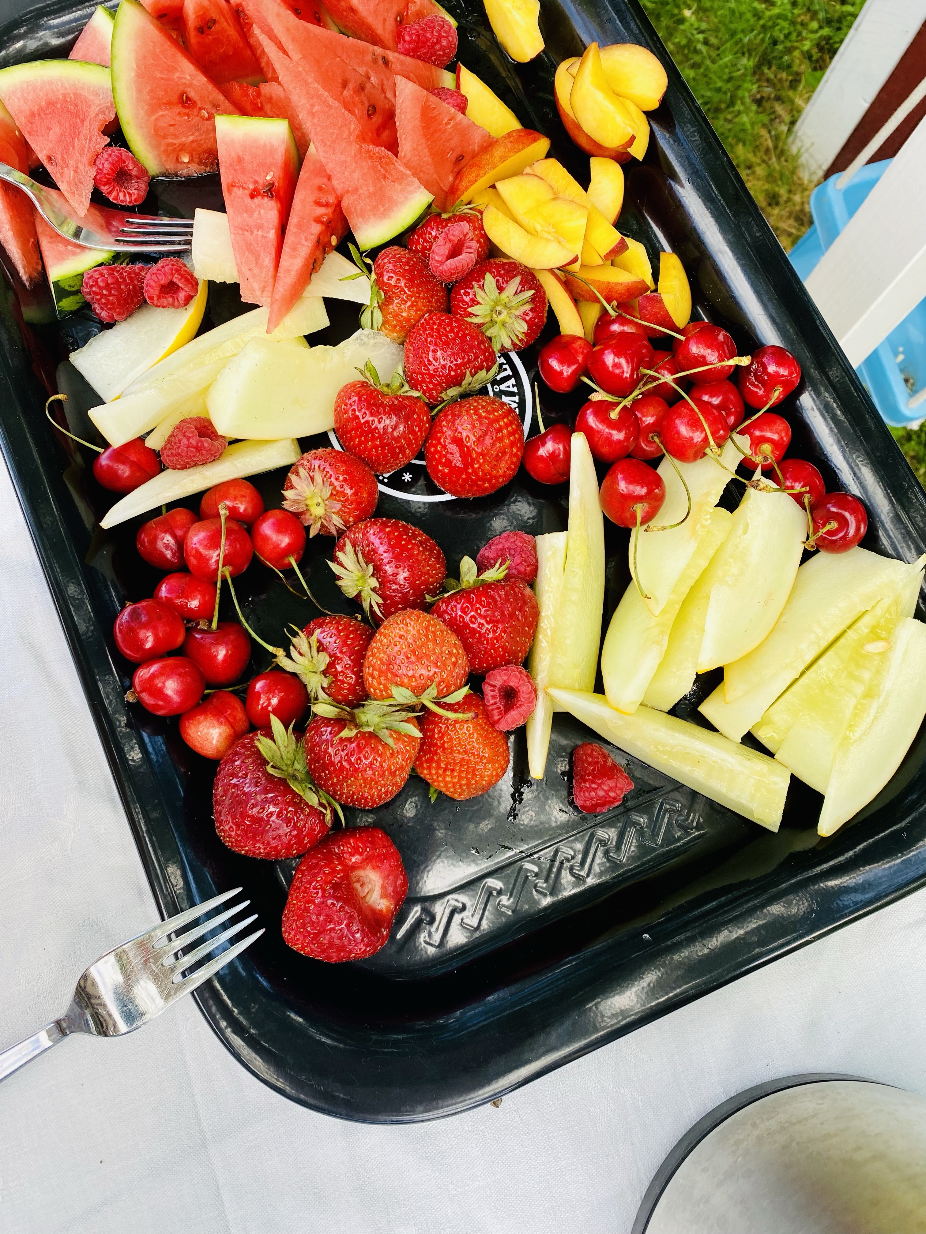 Fintårta, fruktfat och fika i solen hemma i trädgården hos dom. Så mysigt, älskar när vi alla ses. Helst nu när allt är under liiiiite mer normala former.