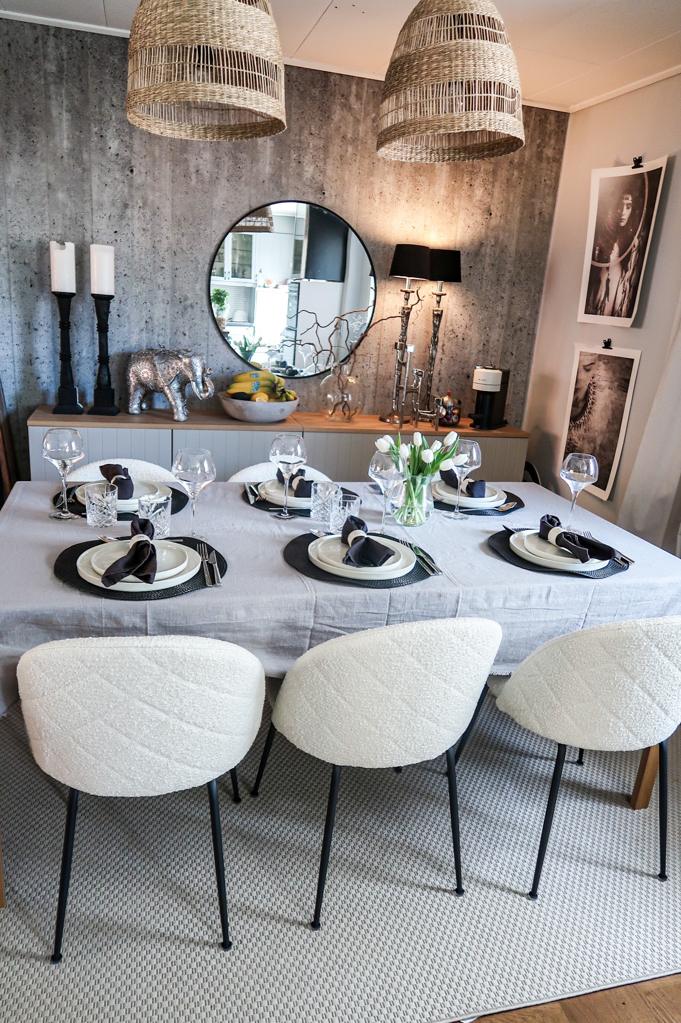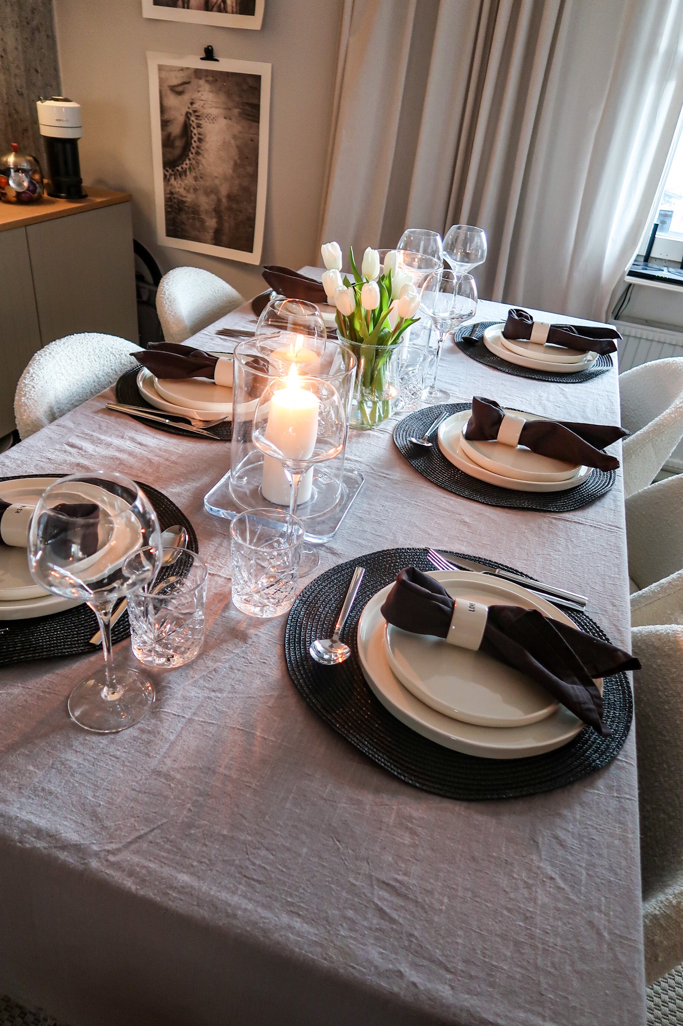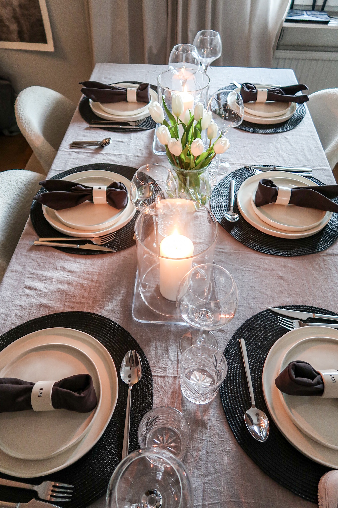 Bestick HÄR (världens bästa pris) // Tallrikar HÄR // Vinglas HÄR (dricker allt ur dessa, skumpa/cola zero/havremjölk) // Dricksglas HÄR (bra pris om man köper 6 st) // Ljuslyktor IKEA // Servetter HÄR // Servettringar H&M Home // Liten vas ICA Maxi