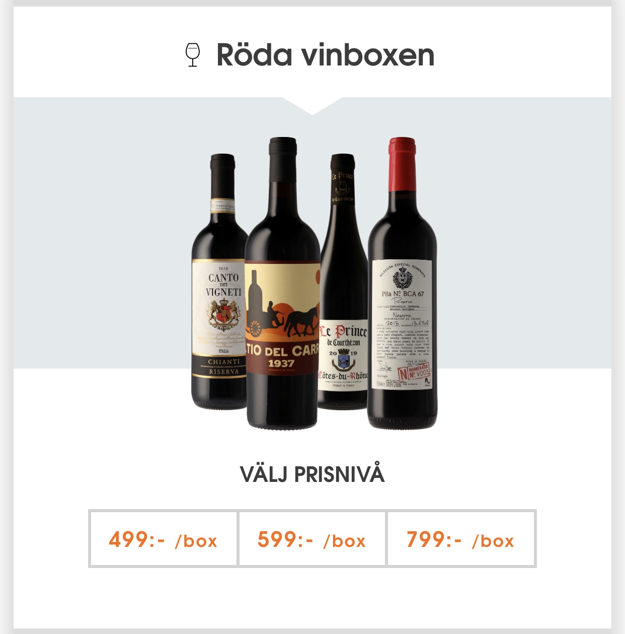 Du kan välja rött/vitt eller blandat som sagt och också vilken prisklass vinpaketet ska hålla. HÄR hittar du all info.