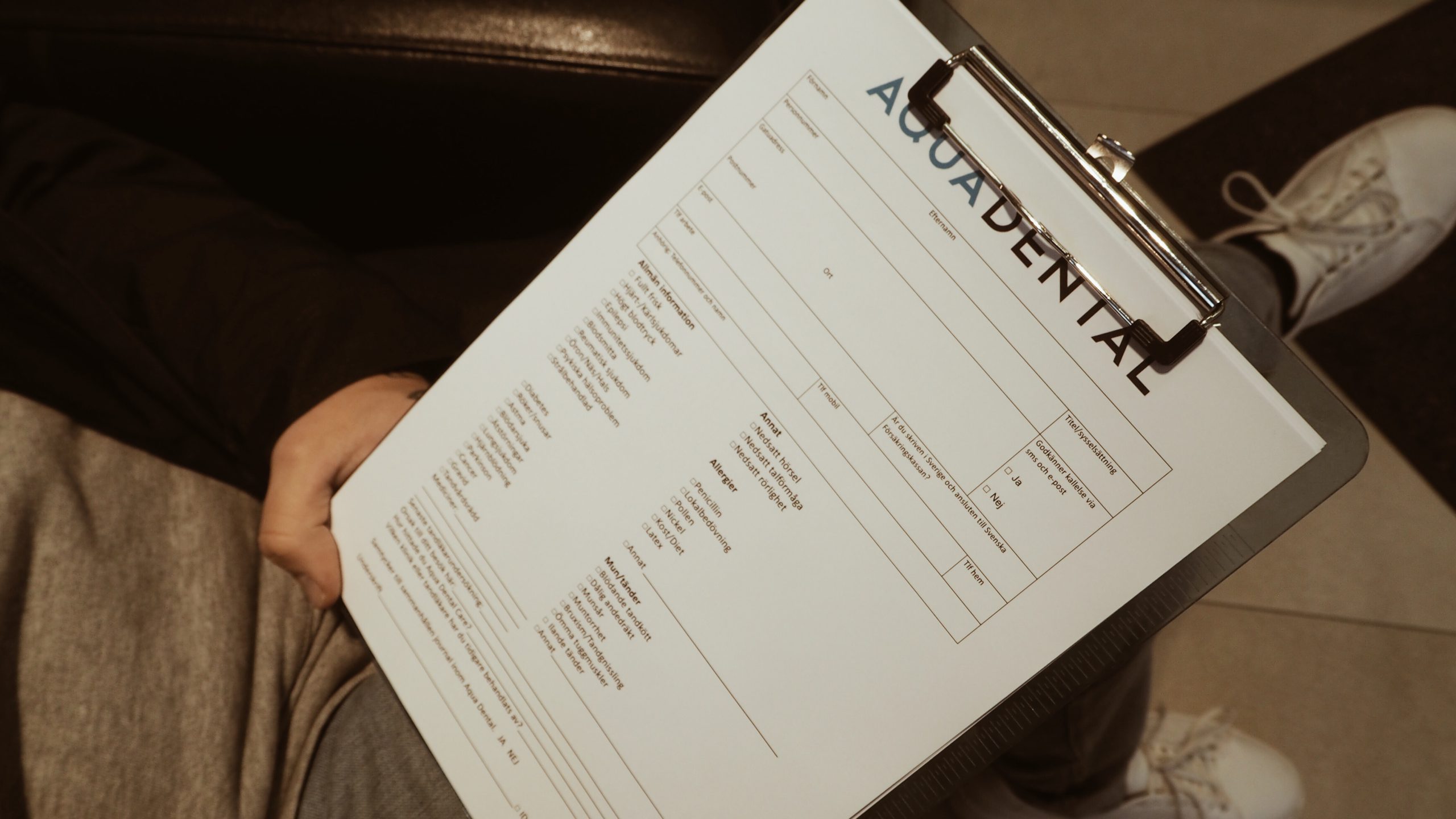 Idag hade då äntligen Tony tid hos Aqua Dental. Han var såklart jättenervös och skämdes så himla mycket över sina tänder. Han fick fylla i lite papper innan.