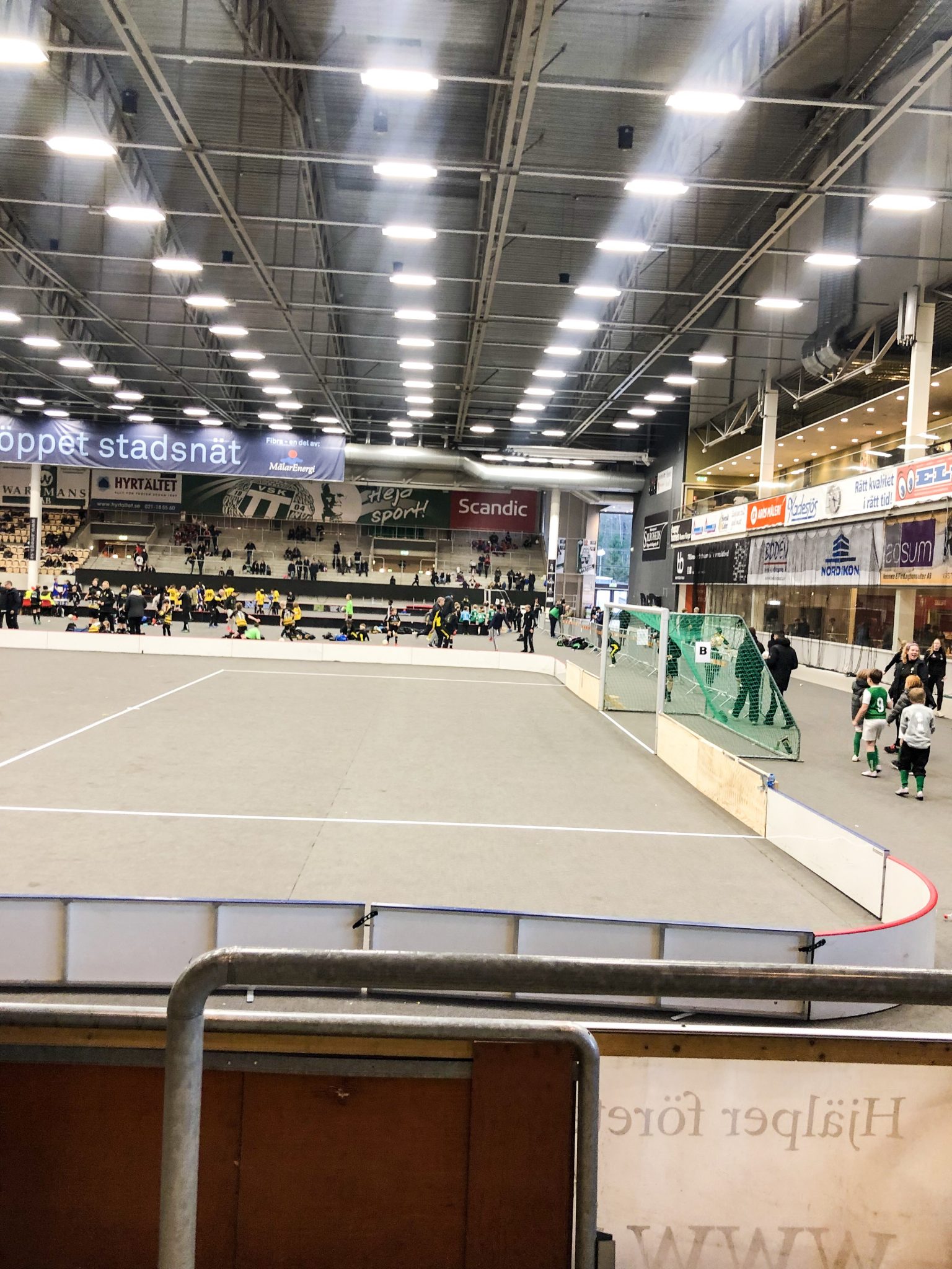 En kall ishall som byggts om till fotbollsarena för den här cupen. 2 föräldrar som har spaghettiben efter en del kånkande. Flytten gick bra! Vi blev många så det var snabbt gjort!
