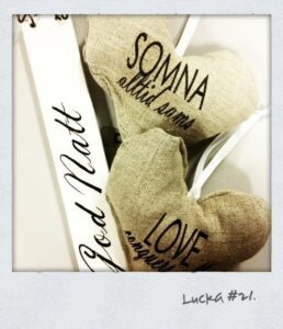 * Ett beiget tyghjärta med texten: ”Somna alltid sams”.