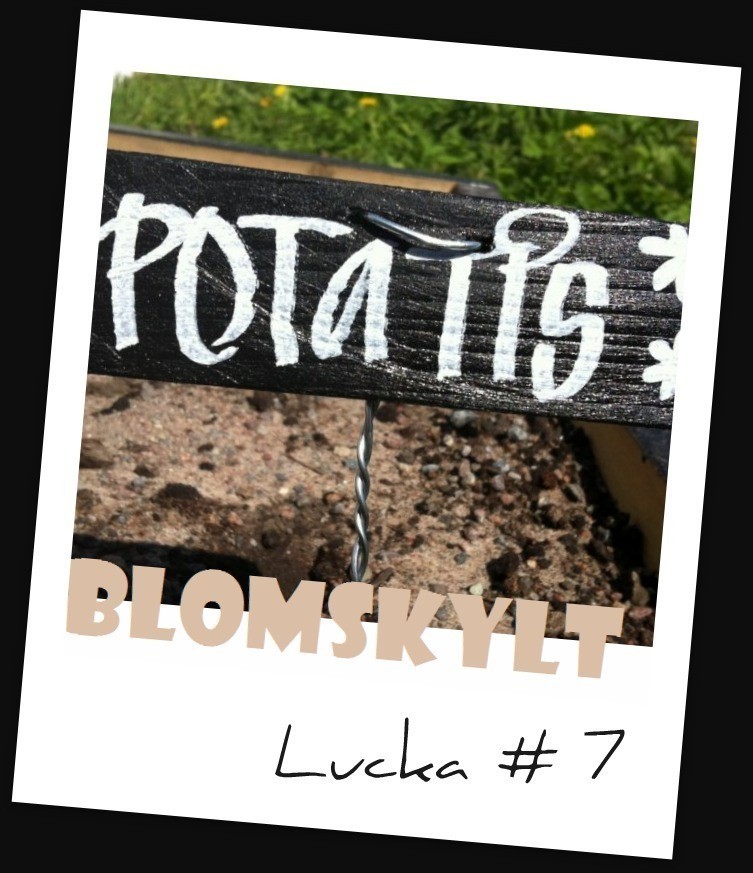 Dagens lucka nummer 7 ser ut såhär. Det är en liten skylt som man kan sätta i en blomma eller varför inte sticka ner i lilla salladskrukan man har står där bredvid spisen. Just den här står det potatis på men det får man välja som man vill. Den finns även att få i vit med svart text. Skyltarna säljs i set om 5 men denna tävling så är det en liten skylt som lottas ut. Välj ord själv men se till att det inte blir för långt. Skyltarna finns här på min hemsida.
