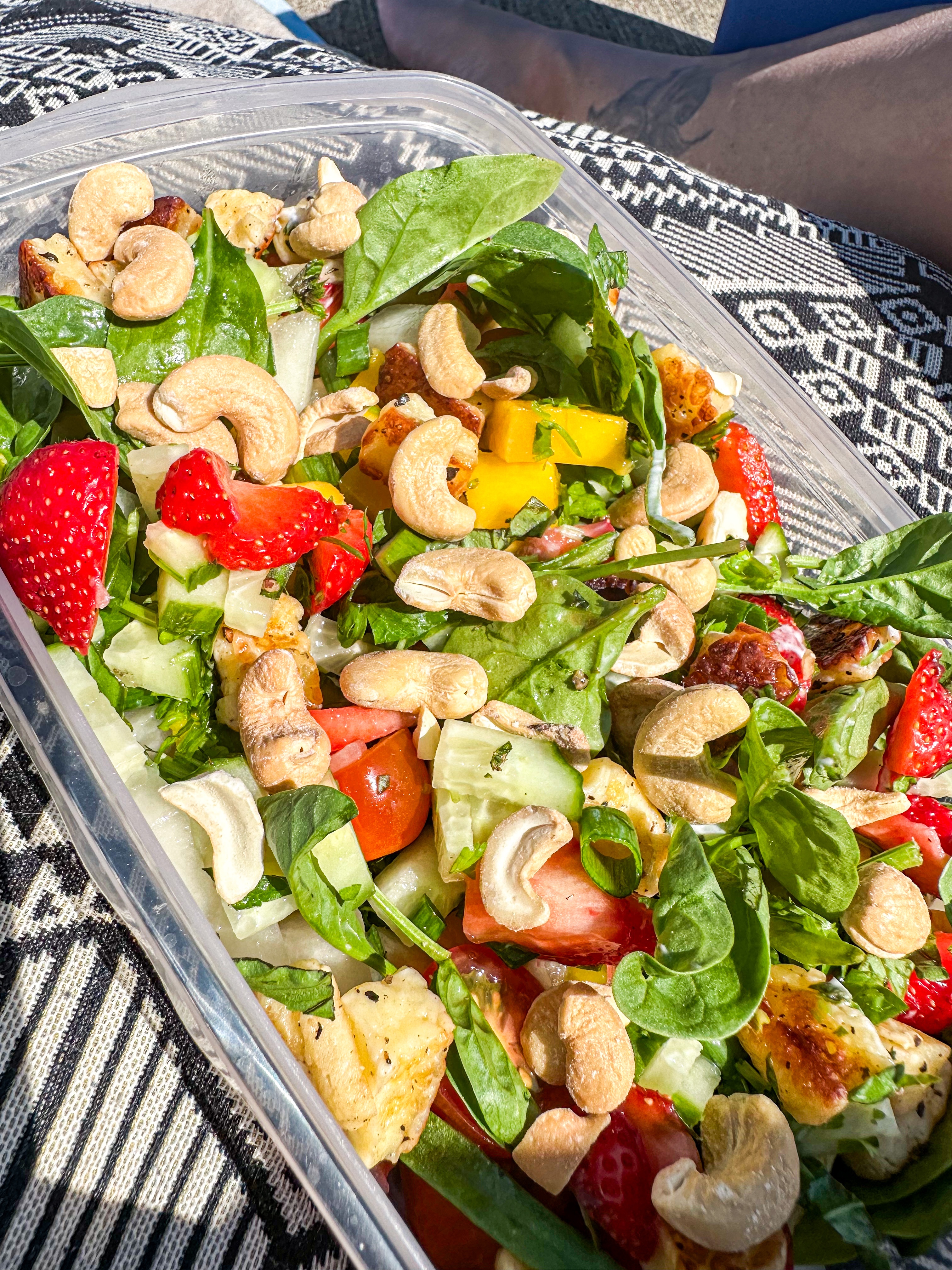 3) Hacka grillosten till tärningar och stek på högre värme i lite lite olivolja. Salta och peppra. Toppa med grillosten och cashewnötter. Servera med vitrlöksdressing. Mums!