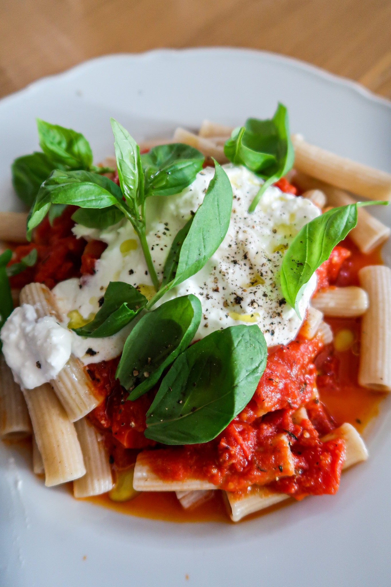 4) Lägg upp pasta och tomatsåsen, klicka på tryffelburrata (gillar du inte tryffelburrata så ta vanlig). Ös på med färsk basilika och ringla över lite olivolja över burratan och sen lite mer nymalen svartpeppar över. Gaaaaalet gott! Har craving redan och vill äta detta varje dag nu. 😂
