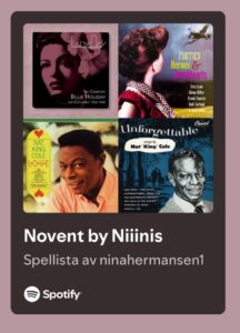 Här hemma spelas t ex denna Noventlista. Följ gärna om du vill sprida lite härliga Novent-känsla hemma. Det är inte julmusik, men artisterna är många som gör julmusik så det ”påminner” lite om julmusik. Perfekt för Novent!