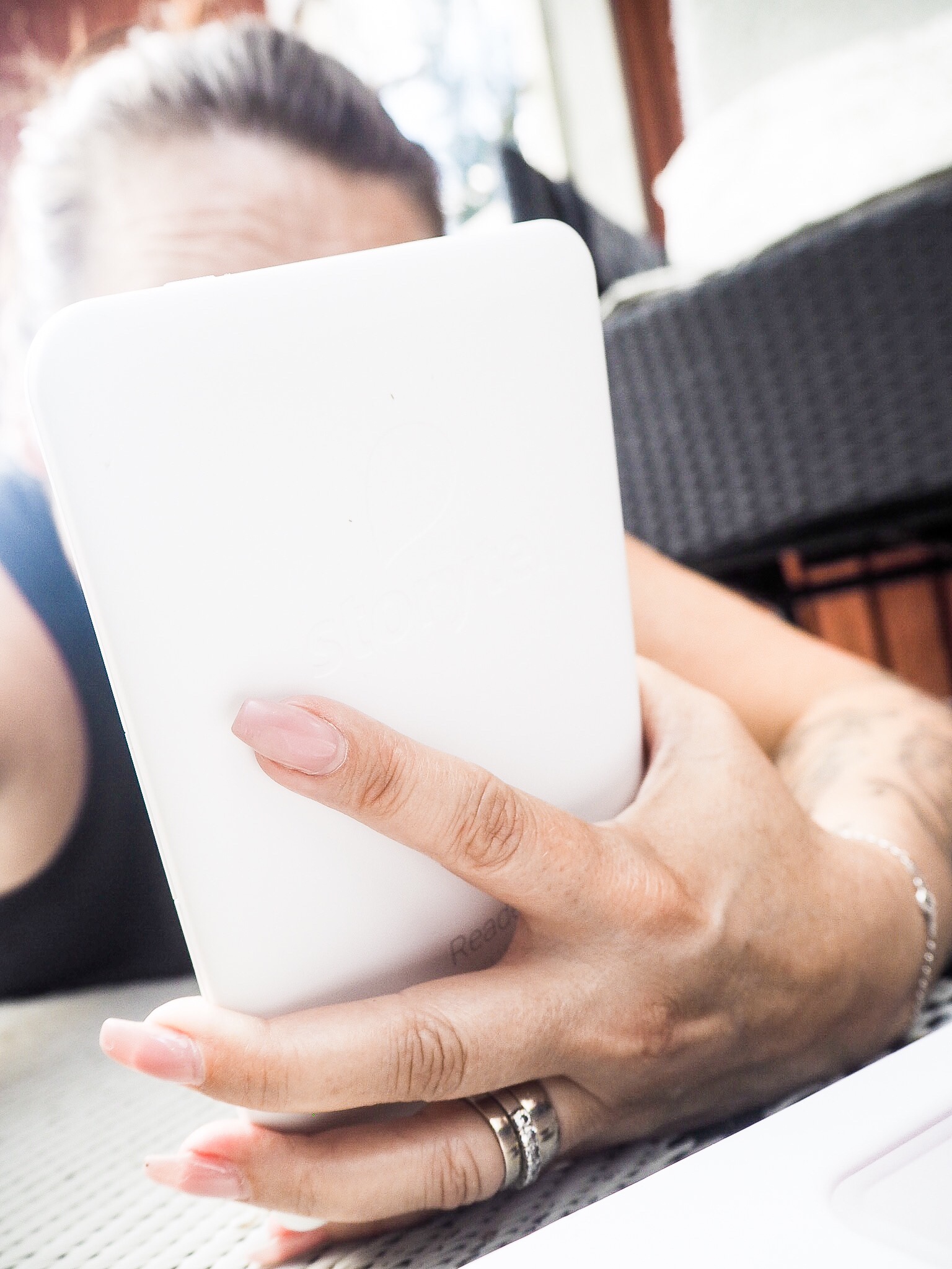 Tony LÄSER ju böcker, alltså vanliga böcker. Jag har höjt lite på ögonbrynen och tänkt att vad krångligt och bökigt när man kan lyssna. Men nu förstår jag honom, det är supermysigt att läsa. Och med den här läsplattan så kan man ju ha med sig 4000 böcker liksom…..väger ändå bara 200 gram!