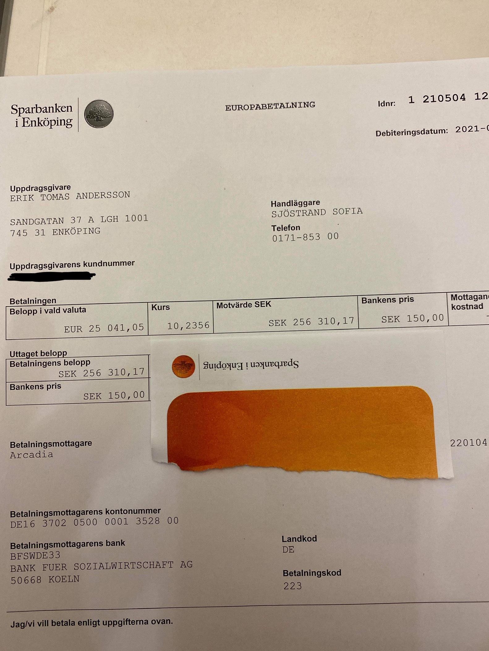 Erik ville att vi skulle visa kvittot på hans betalning till Arkadiakliniken. Så här har ni den…. Erik är en person som absolut inte vill att någon ska tro att det ligger något fuffens bakom detta utan vill vara helt transparent när det kommer till vad pengarna som samlats in används till.
