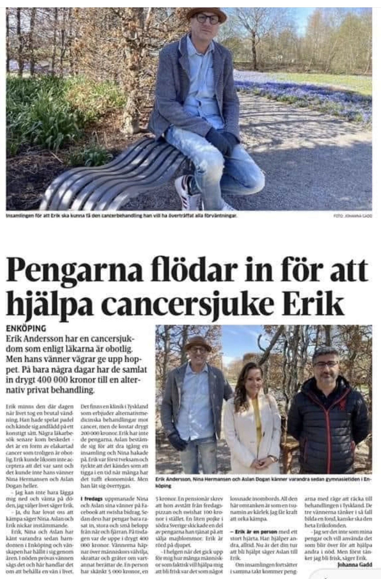 Tack för alla bidrag som kommit in. Vill du vara med och bidra så kan man swisha direkt till Erik på telefonnummer: 0723 – 191219. Det ska gå att få Erik frisk, det SKA gå! 🙏🏻❤️