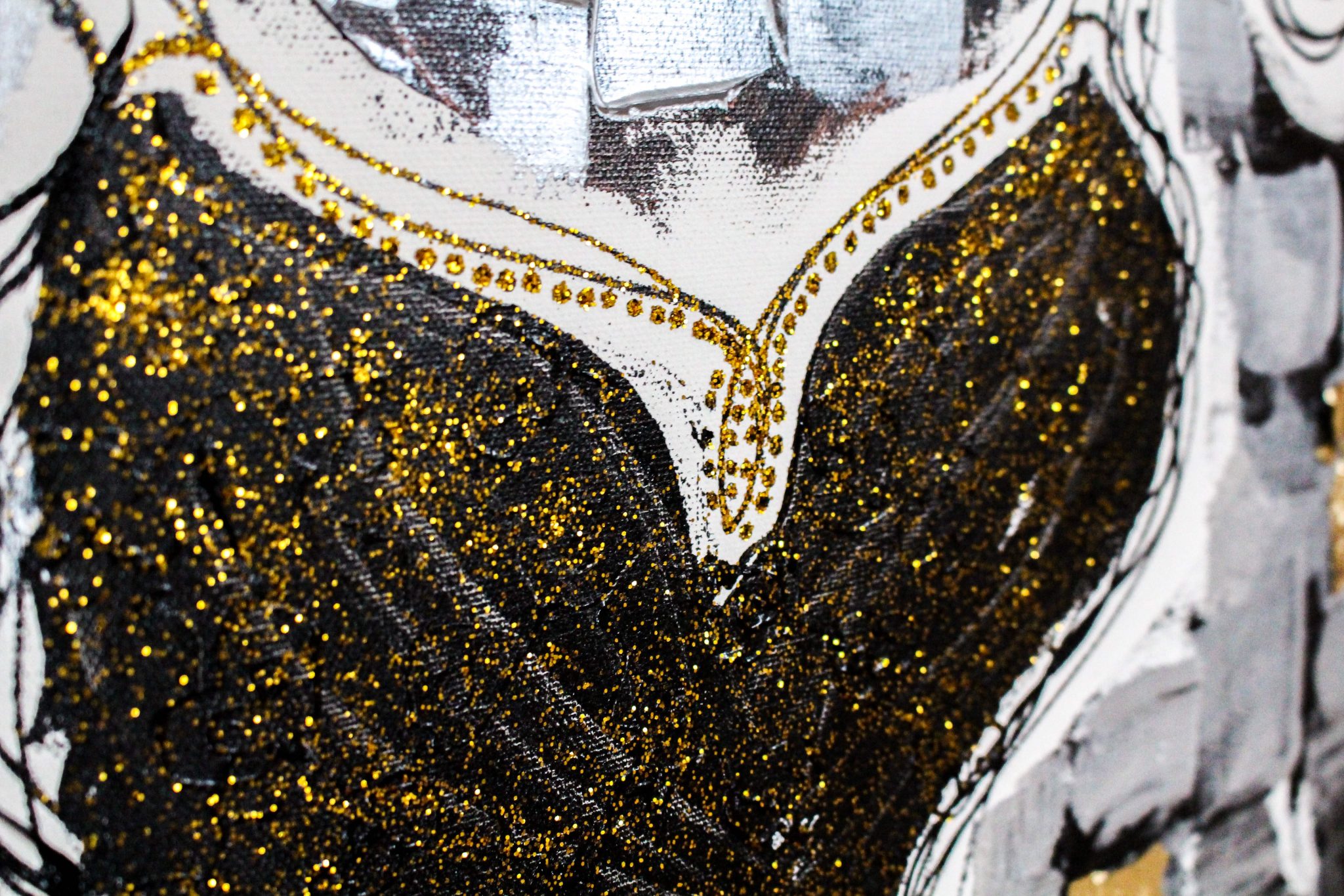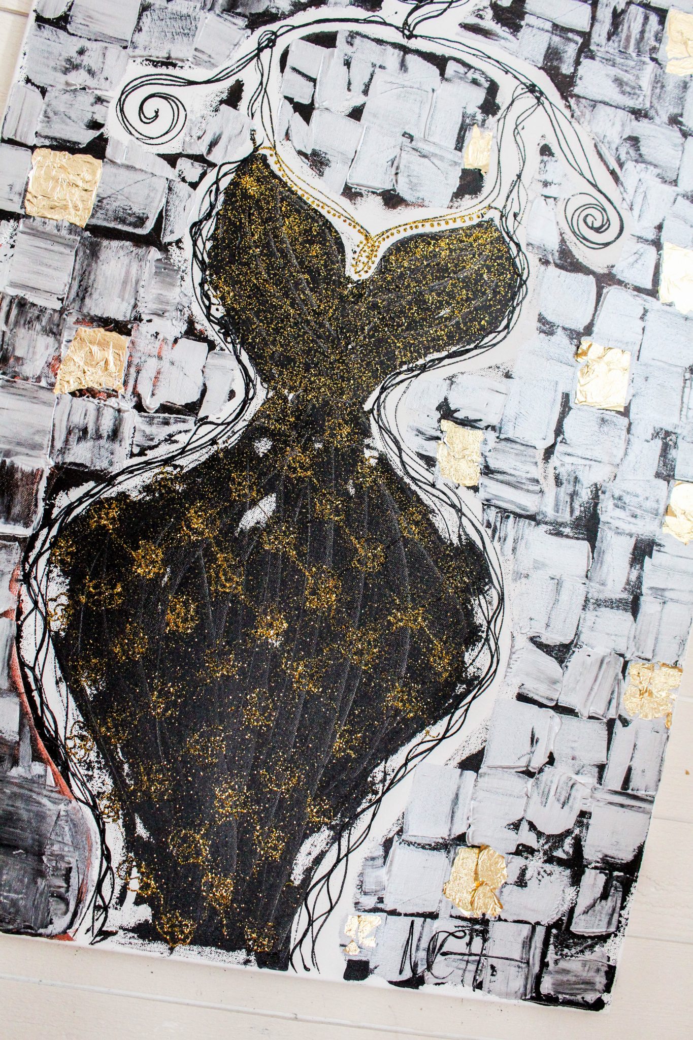 När jag målar så har jag ju först haft en liten tanke men vad jag ska göra. Den här hade jag inte så mycket tanke med utan jag satte bara igång. Det roliga är att jag på något sätt aldrig är i nutid. När jag målar klänningar så är jag långt tillbaka i tiden. Här kändes det som man var i en rökig bar i New York någonstans mellan 20 och 40 talet. Långa cigaretthållare, långa handskar, runda höfter och röda läppar. Det guldiga i bak är väggarna i baren – exklusivt och pampigt. Skillnaden är nog bara att kvinnosynen i mina målningar har en helt annan historia.
