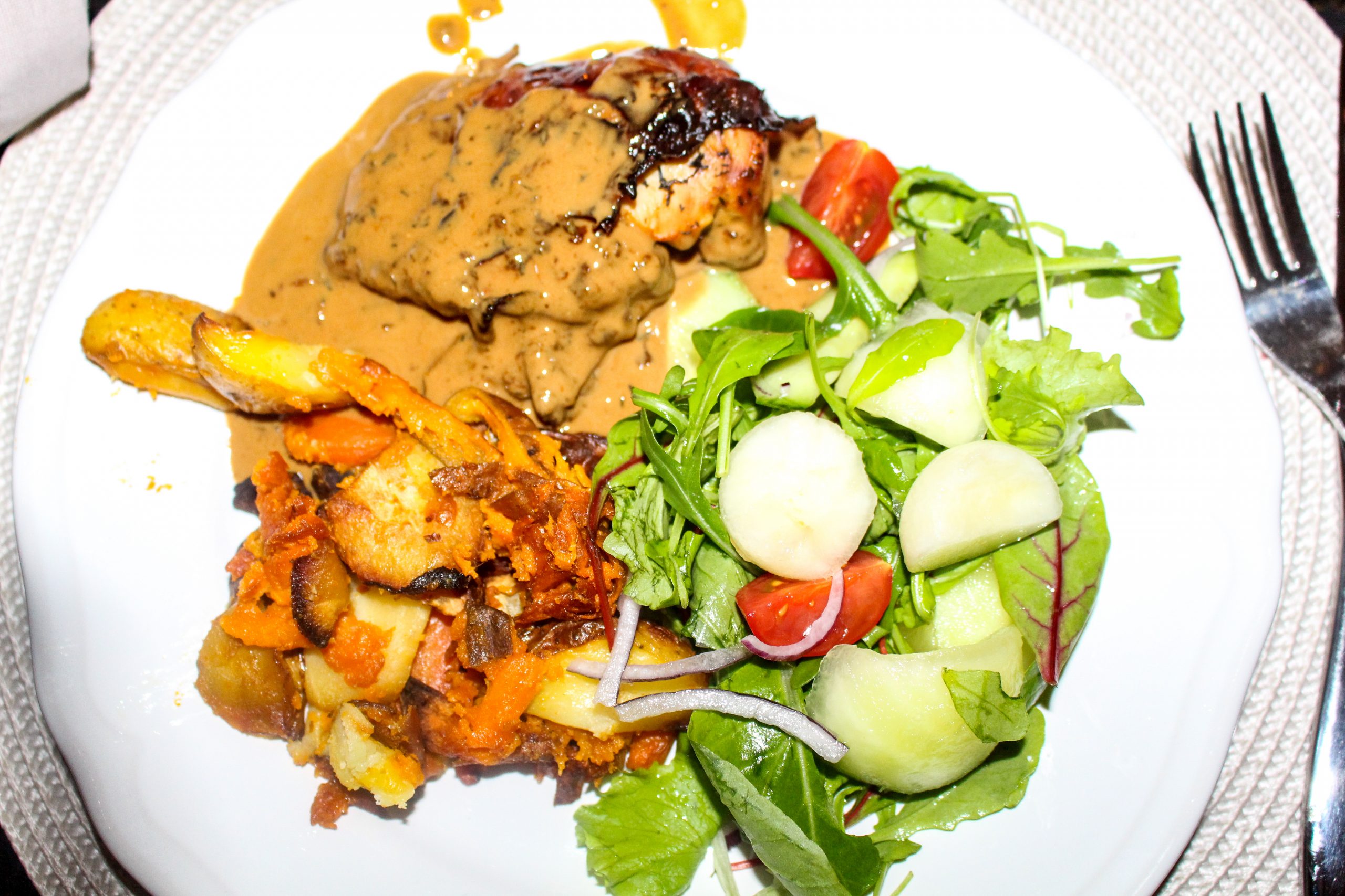 Vi hjälptes åt att laga maten för kvällen som blev Bruschetta till förrätt. Prosciuttoinlindad kycklingfile i galet god sås, rotfrukter i ugn och grönsallad till varmrätt. Till efterrätt blev det cheesecake i glas. Dessvärre kom jag ihåg idag att jag glömde riva i citron i själva cheesecakesmeten (jag åt en annan efterrätt)…. haha…. jaja. Du ska få recept på den sen i alla fall.