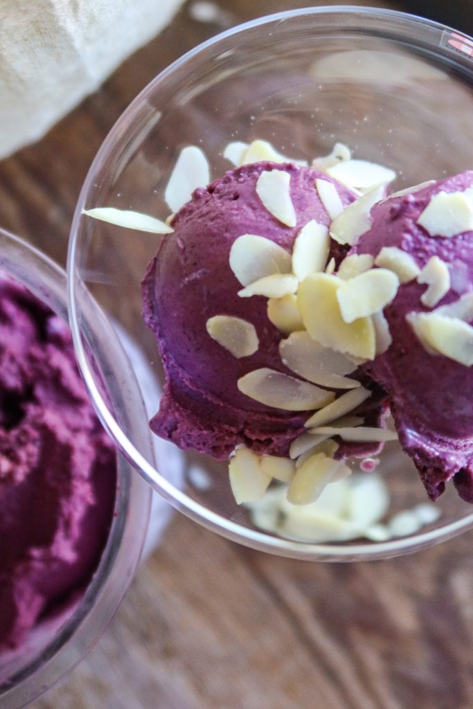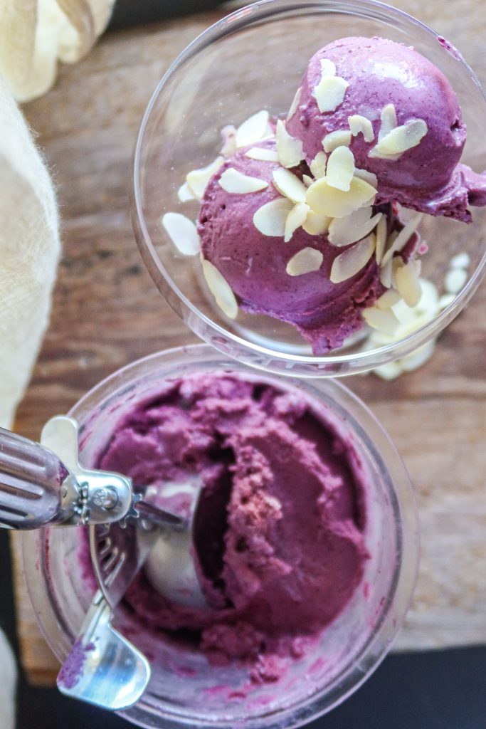 Den här glassen är vegansk, naturligt sötad med honung och så har jag fyllt den med mitt superdeluxe näringsrika pulver med bl.a. blåbär och aronia? Den blir så krämig och helt utan tillsatser. Ja, tack!