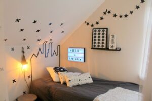 Ovanför hans säng gjorde jag en vimpel av svart grovt papper som jag klippte stjärnor ur och tejpade fast på ett hampasnöre. Tavlan är en RIBBA ram från IKEA som jag bara satt in presentpapper i för den där grafiska looken.