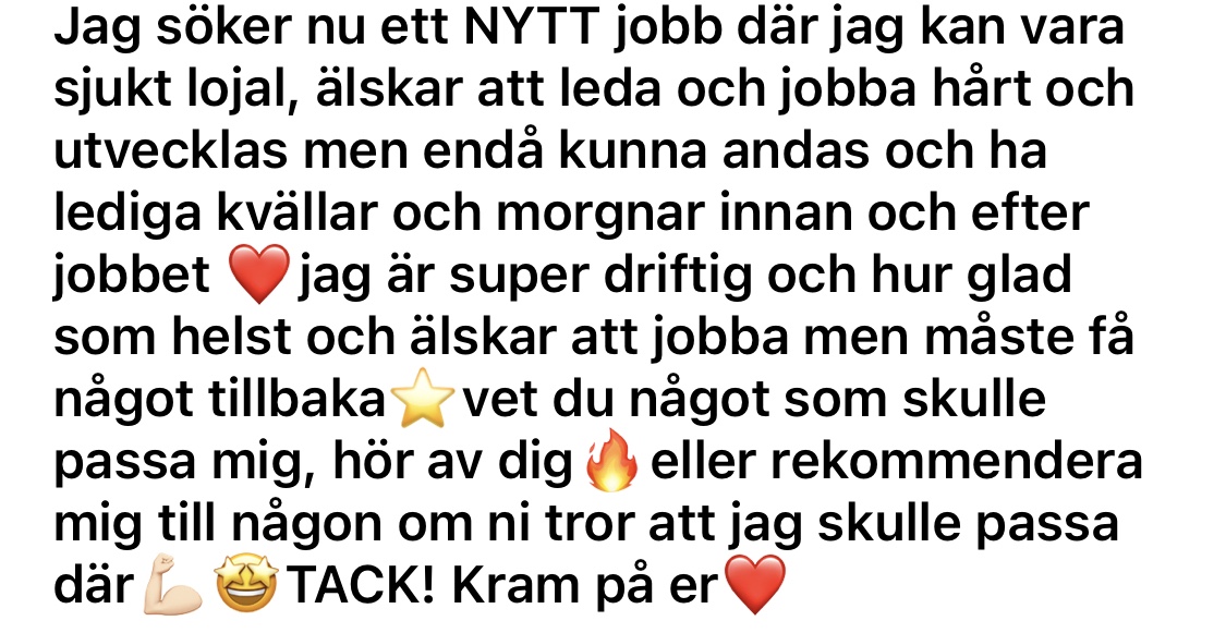 Just ja, medan jag har er på tråden…. min fina svägerska Eva söker jobb. Hon har jobbat i klädbranschen i många många år, både i chefsposition och som säljare. Efter flera år på Twilfit så söker hon nu nytt arbete. Jag vet verkligen ingen som är så driftig, lojal och duktig på sitt jobb som Eva. Hon viker ut och in på sig själv för sitt jobb, har alltid gjort. Eva är alltid glad och så himla trevlig och snäll, när jag varit på Twilfit och sett hur hon tar hand om sina kunder har jag blivit tårögd. Så inkännande och fin, kan tänka mig att människor som stött på henne känt sig både sedda och viktiga. Samtidigt har hon gjort samma för sin personal…. Tänk vilken fin egenskap att kunna ge människor den känslan. Såhär skriver hon själv på sin instagram: