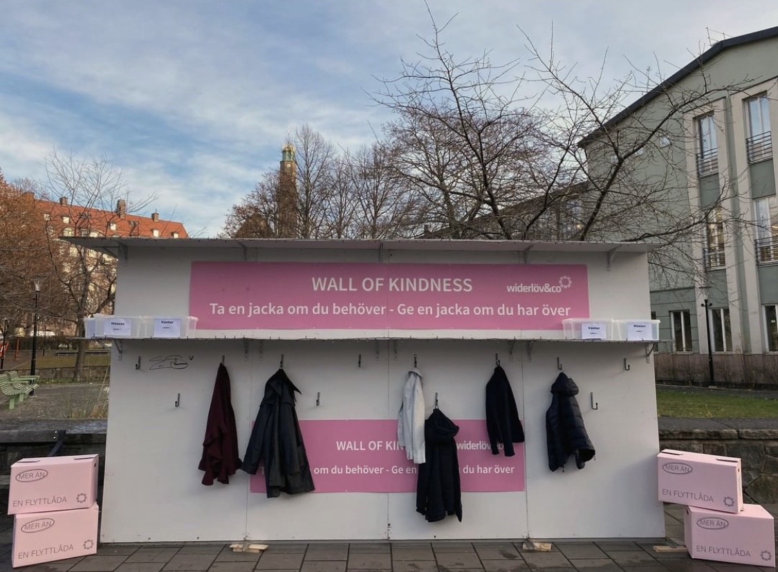 Wall of kindness heter den och ligger utanför Birger Jarlsgatan 76. Dessa jackor är till dom som behöver, som kanske måste sova ute. Har du någon jacka över så vet du var du kan hänga den. Våra ska hängas här.