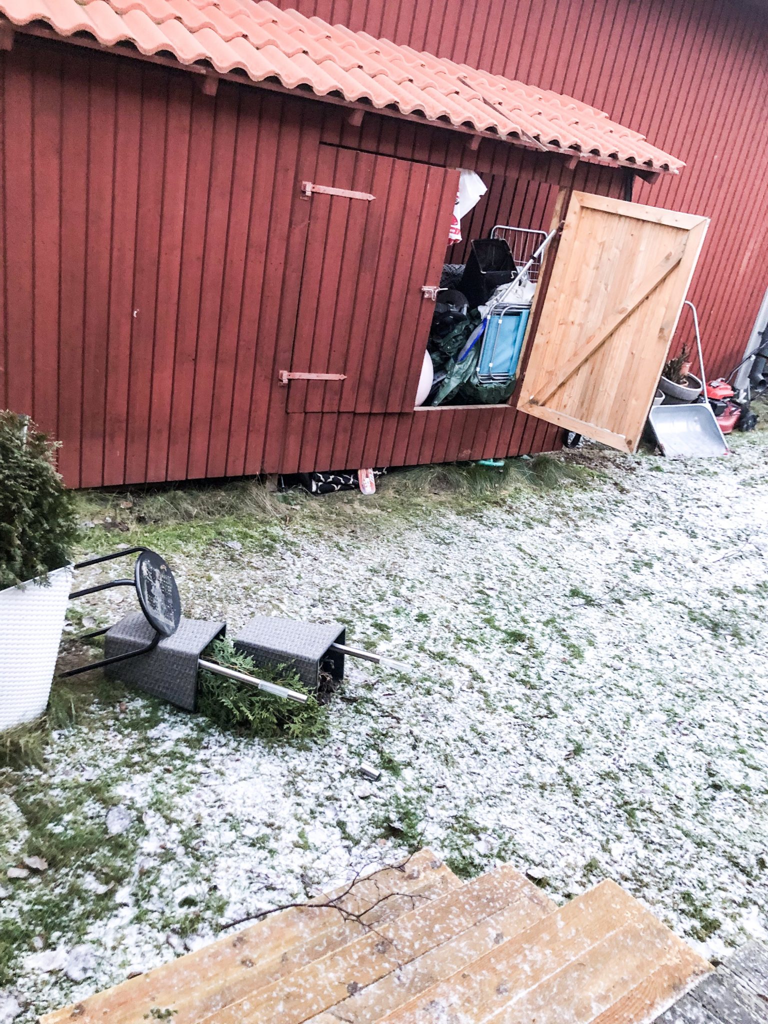 Det är mycket grenar och kvistar ute på vägarna och ute på gårdarna. På vår baksida har tujorna flugit all världens väg. T.o.m luckan till uteförrådet hade flugit upp. Det har låtit som om huset varit på väg och flyga upp i himlen alltså, så att allt rasat lite var inte alls konstigt. Förvånad över att studsmattan stod kvar.
